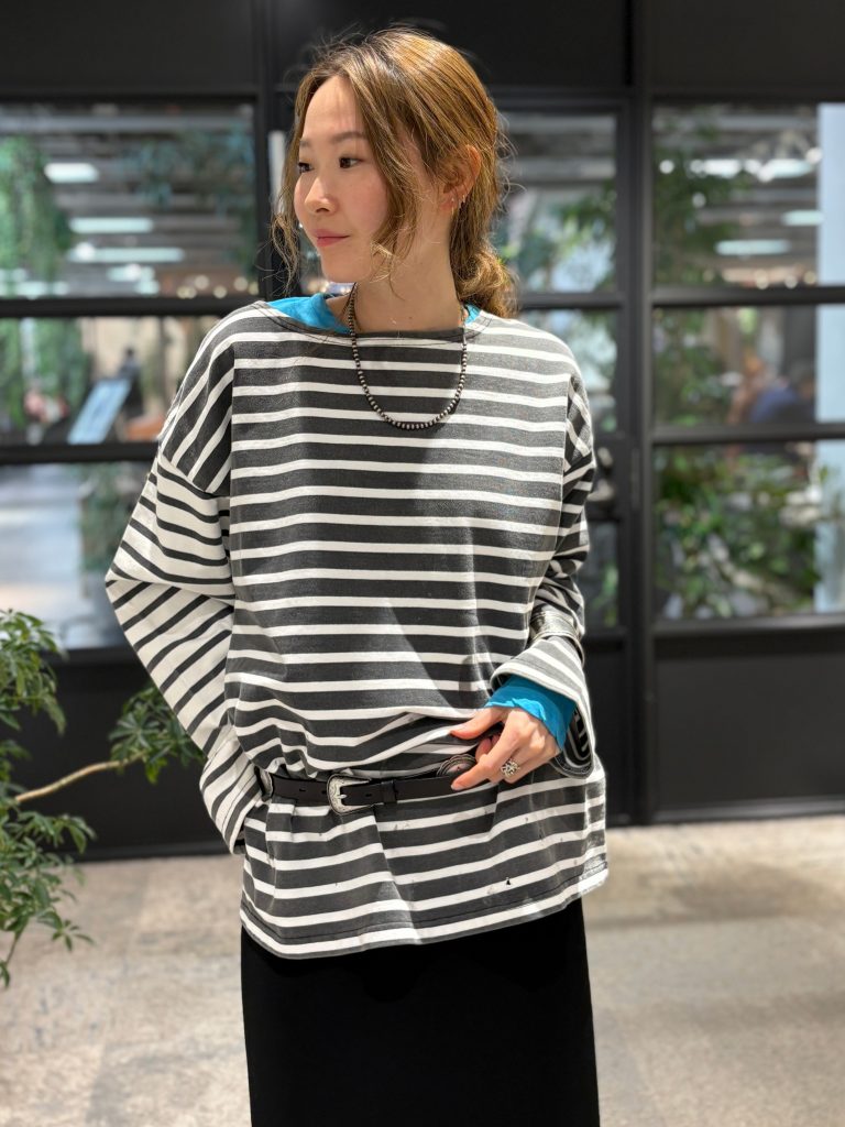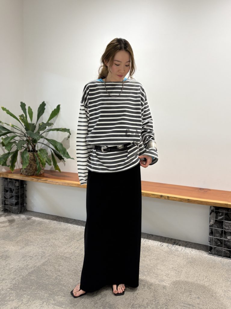 カレンソロジー5周年時に好評を博した“<Archive&Style×Curensology>ダメージバスクボーダープルオーバー”がバイカラーへとアップデート。女性の美しさを引き立たせるメンズライクなヴィンテージの深みを、オーバーサイズかつシンプルなシルエット、ハードな加工やダメージ、ペイントの絶妙なバランスで表現した逸品です。and STでは先行予約受付中です!ボトムスに無駄を削ぎ落としたミニマムなデザインの“ストレッチタイトスカート”を合わせて、全身のシルエットに美しい抑揚をプラス。 トップスのオーバーサイズでタフなボリューム感と、スカートのシャープなIラインが、互いの魅力を引き立て合う絶妙なバランスを生み出します。 差し色にレイヤードした首元と袖から覗くブルーがカレンソロジーらしいアクセントに♪