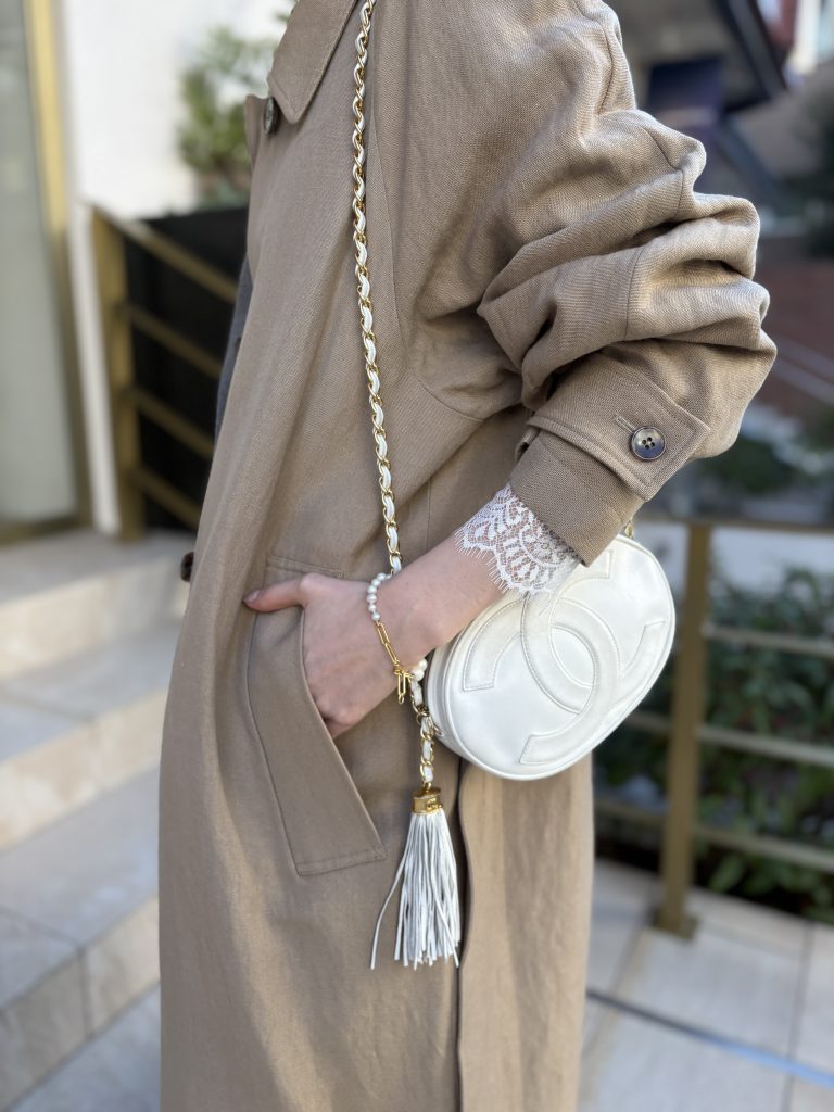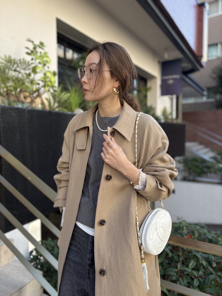 今回はインナーに新作の“ヘンリーレースロングスリーブTシャツ”を合わせて、コートの袖から繊細なレースを覗かせるレイヤードテクニックをプラスしました♡ カジュアルなデニム合わせも、手元のレースとパールのアクセ使いで、一気に華やかで女性らしい印象に。 ウエストのドロストを絞ってシルエットを変えたり、付属のチンベルトで襟を立てたりと、その日の気分でアレンジを楽しめる一着です。