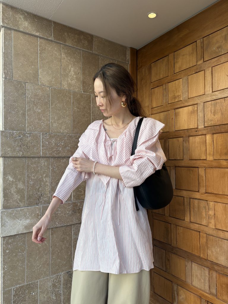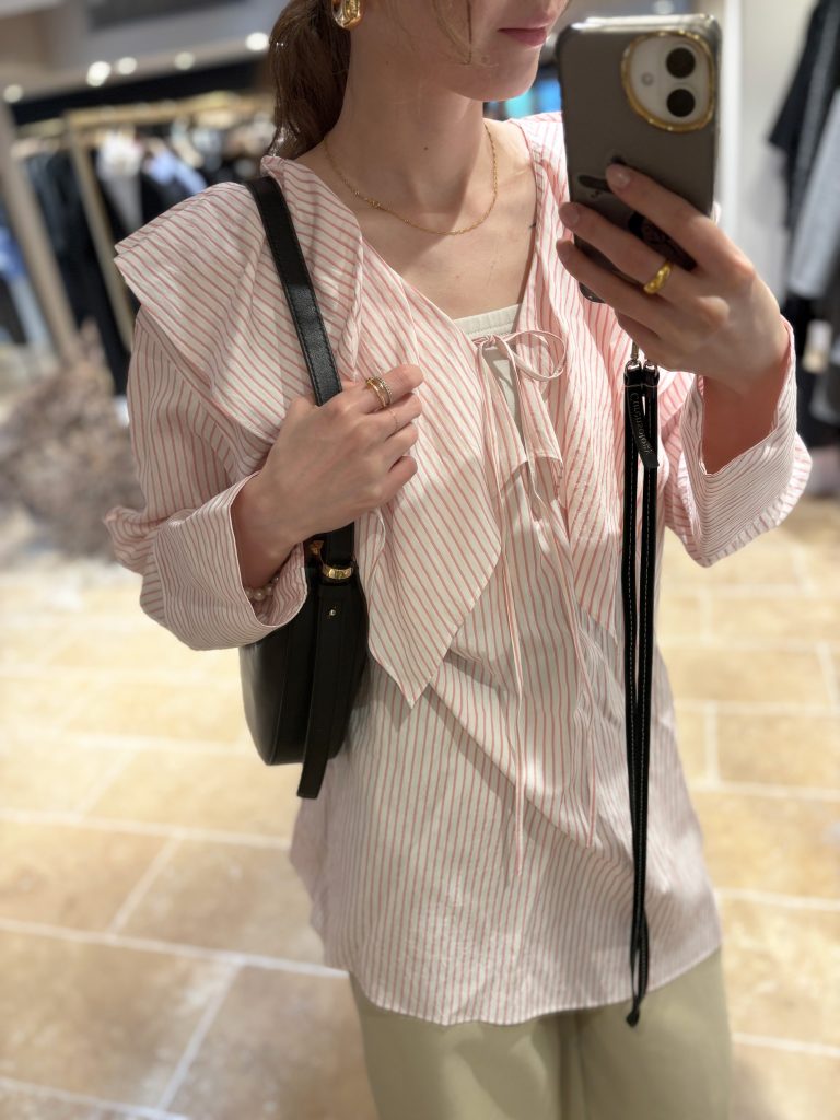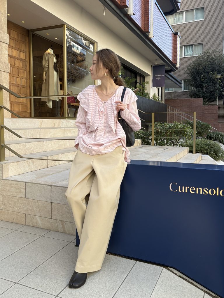 今回は、今月待望の再入荷となった人気アイテム“トリプルクロスパンツ”と合わせて、素材のコントラストを楽しむスタイルに。 ブラウスの柔らかな風合いに対し、あえてハリと厚みのある構築的なパンツを合わせることで、リラックス感の中にもモードな雰囲気が漂うスタイリングに。 ピンク×ベージュの柔らかな配色は、まだまだ寒い1月の街並みにも春の明るさを運んでくれます♡