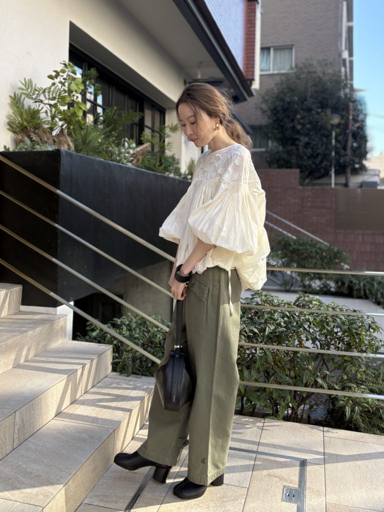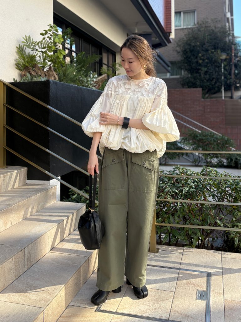 今回は、ヴィンテージのような加工感にこだわった名品“<&RC>ヴィンテージライクカーゴパンツ”と合わせて、フェミニンなブラウスをあえてラフに着崩した大人の甘辛MIXスタイルに。 繊細なブラウスと本格的なカーゴパンツ、カレンソロジーらしい対照的なテイストの掛け合わせが、ワンランク上のこなれ感を演出してくれます♪