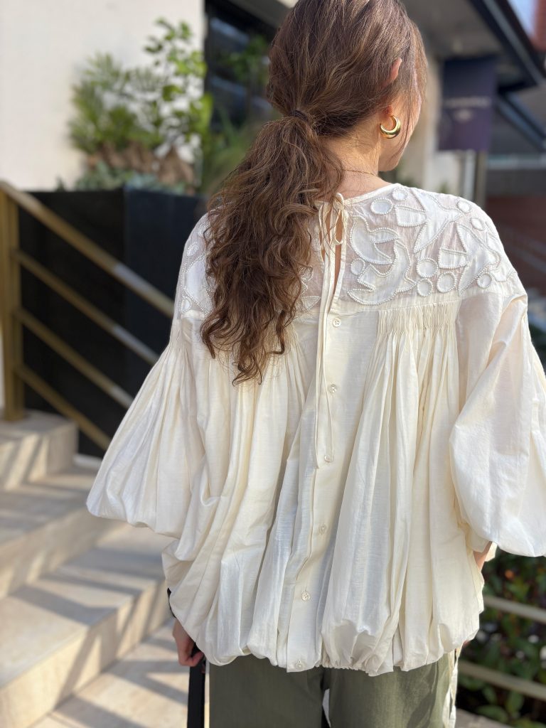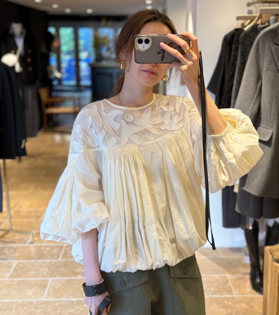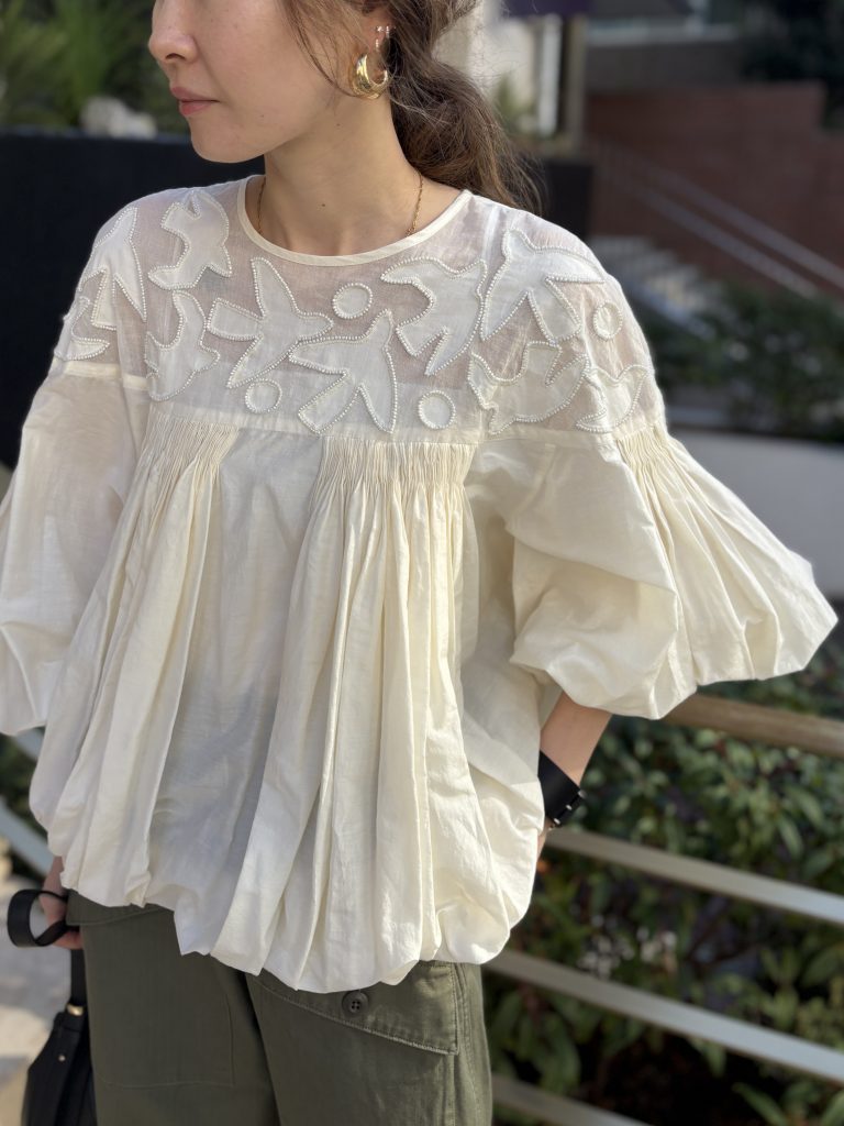 ずっと入荷を心待ちにしていた、オリジナルのバード刺繍が目を惹く“バードシシュウブラウス”を主役にしたスタイリング♪光に透ける、綿シルクやオーガンジーの軽やかな素材感が、一気に春へのムードを高めます。ビーズ刺繍やハンドスモッキングを一つひとつ手作業で施した、インドの職人技が光る奥行きのある一着。 裾のリボンを絞ることでシルエットや着丈を調整できるので、ボトムスとのバランスが取りやすいのも嬉しいポイント。