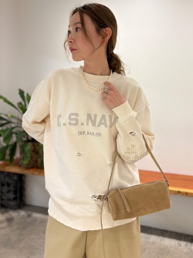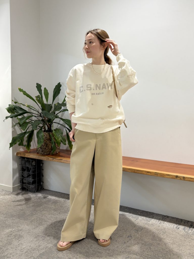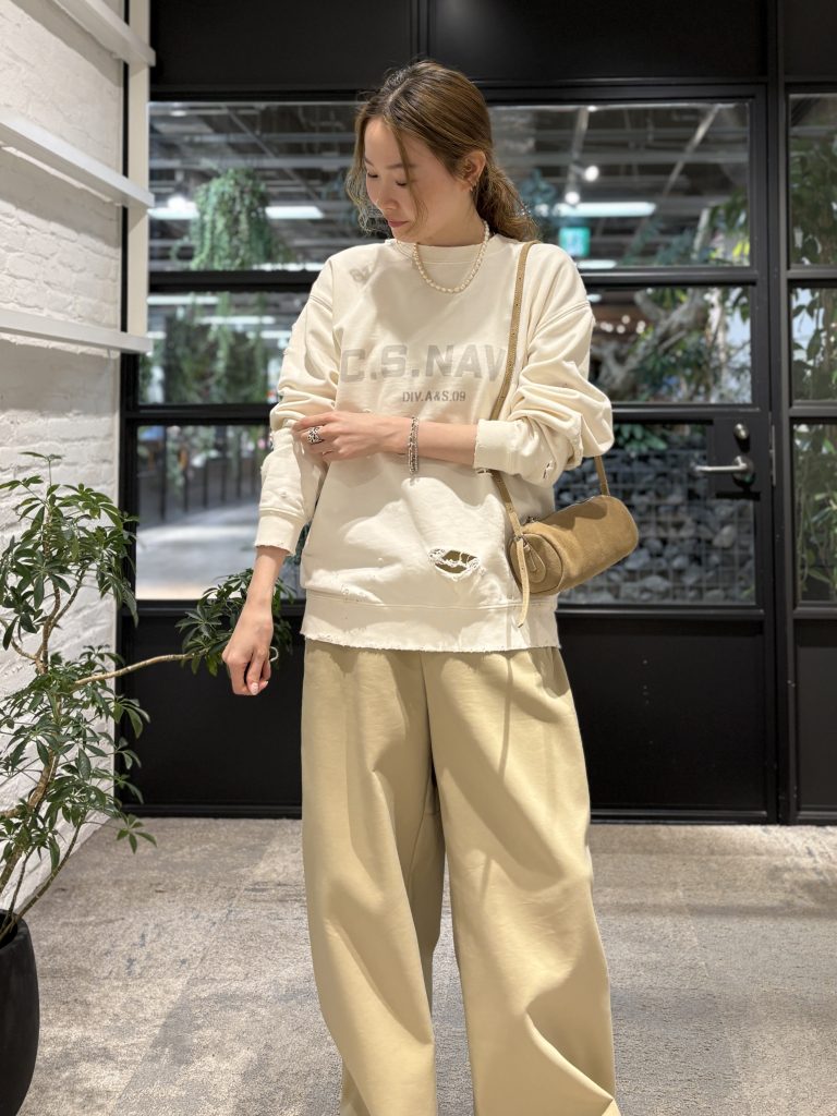 50年代~60年代のUS NAVYスウェットを徹底的にリファレンスした、至高の新作スウェットが登場♪“Archive&Style”とのスペシャルなコラボアイテムです。リアルな色落ちやペンキ飛ばし、肘部分のワッフル生地によるリペア加工など、ヴィンテージ好きも唸る奥行きのある表情が魅力。当時の雰囲気はそのままに、ネックの詰まりやシルエットを計算し尽くすことで、大人の女性が懸念なく楽しめる一着です。「U.S.NAVY」を「C.S.NAVY」にアレンジした、カレンソロジーらしい遊び心あるグラフィックもポイント。and STでは先行予約受付中です!今回は、再入荷したばかりの名品“トリプルクロスパンツ”と合わせて、テイストのコントラストを楽しむスタイリングに。 スウェットのくたっとした柔らかな風合いに対し、あえてハリと厚みのある構築的なパンツを合わせることで、ラフなカジュアルスタイルを一気に都会的なムードへ。