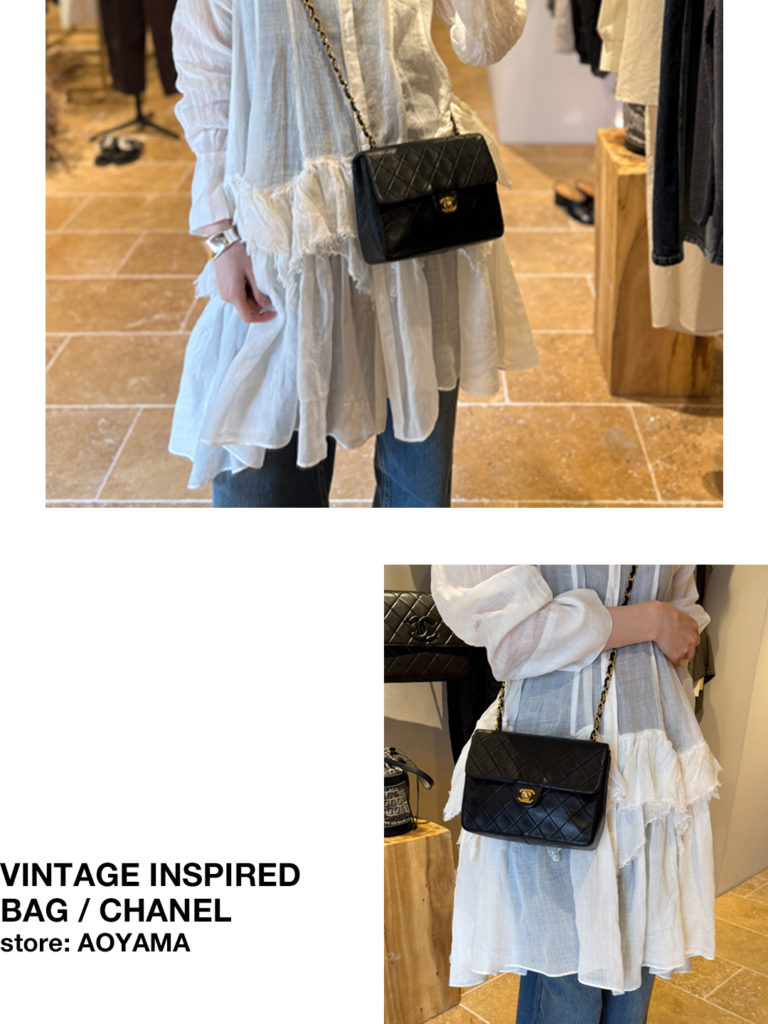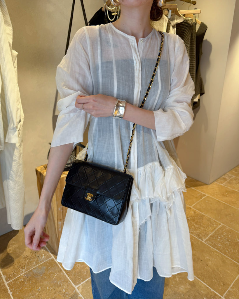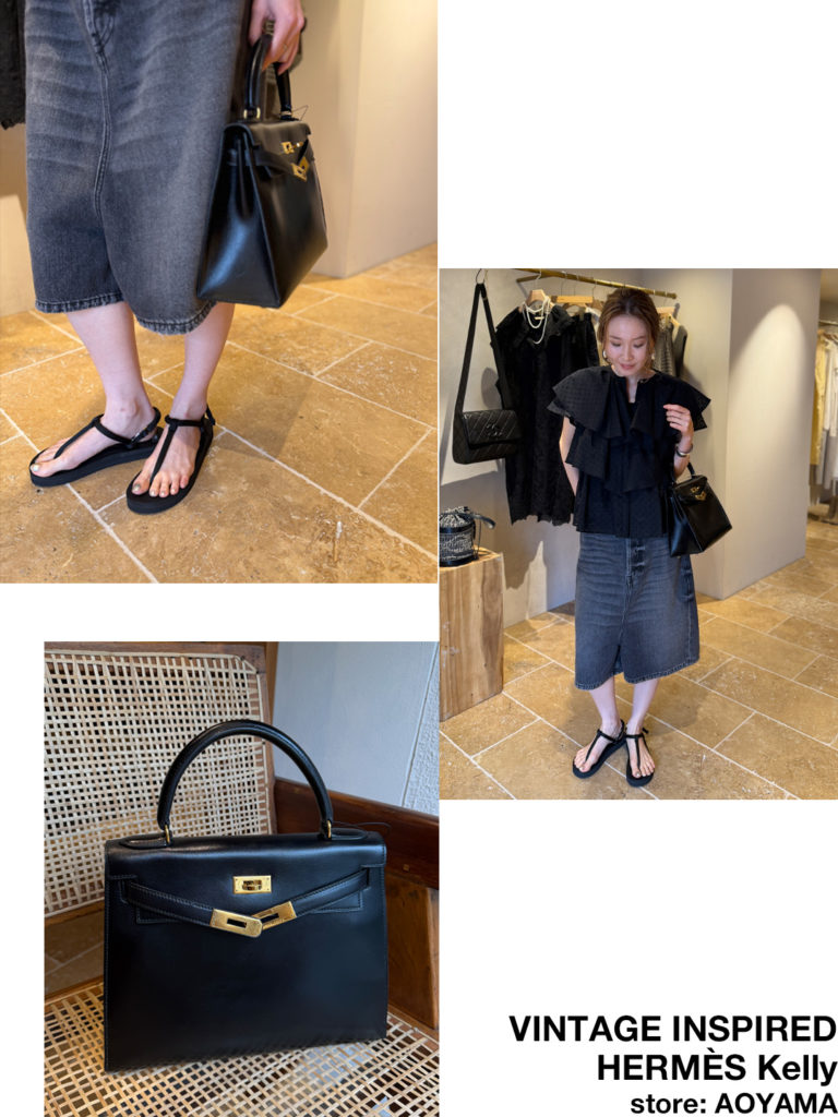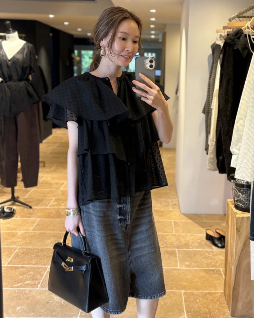 ドットジャガードの贅沢なフリルに一目惚れしたブラウス。甘さがあるからこそ、ハーフデニムとスポーティなサンダルでラフに振りきりました。バッグは贅沢にヴィンテージのケリーを合わせて引き締めつつ、大人の遊び心を効かせた抜け感のあるスタイリングです。