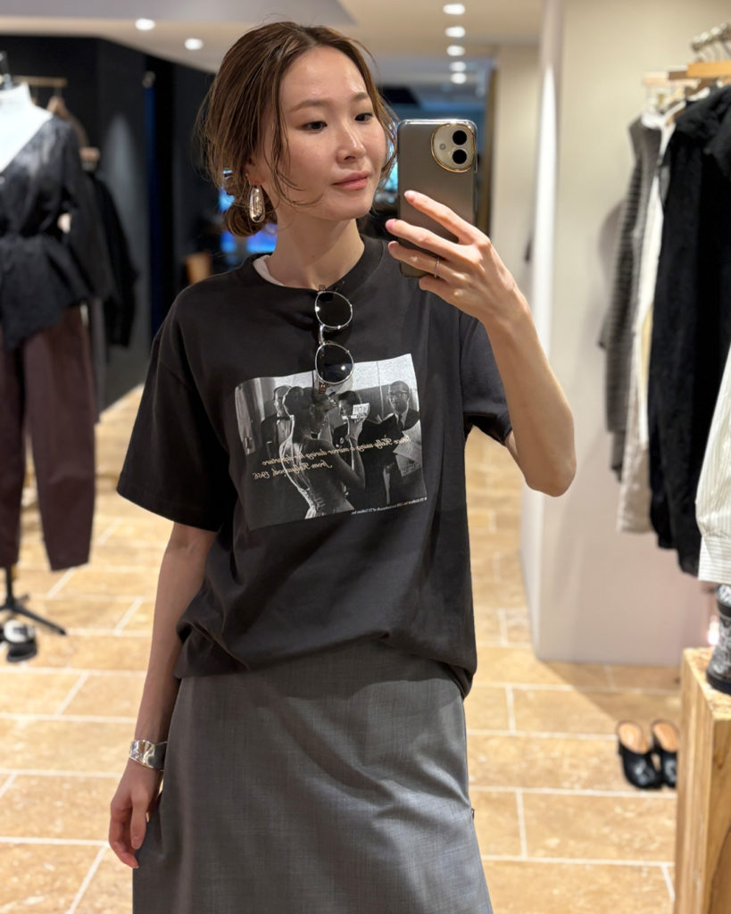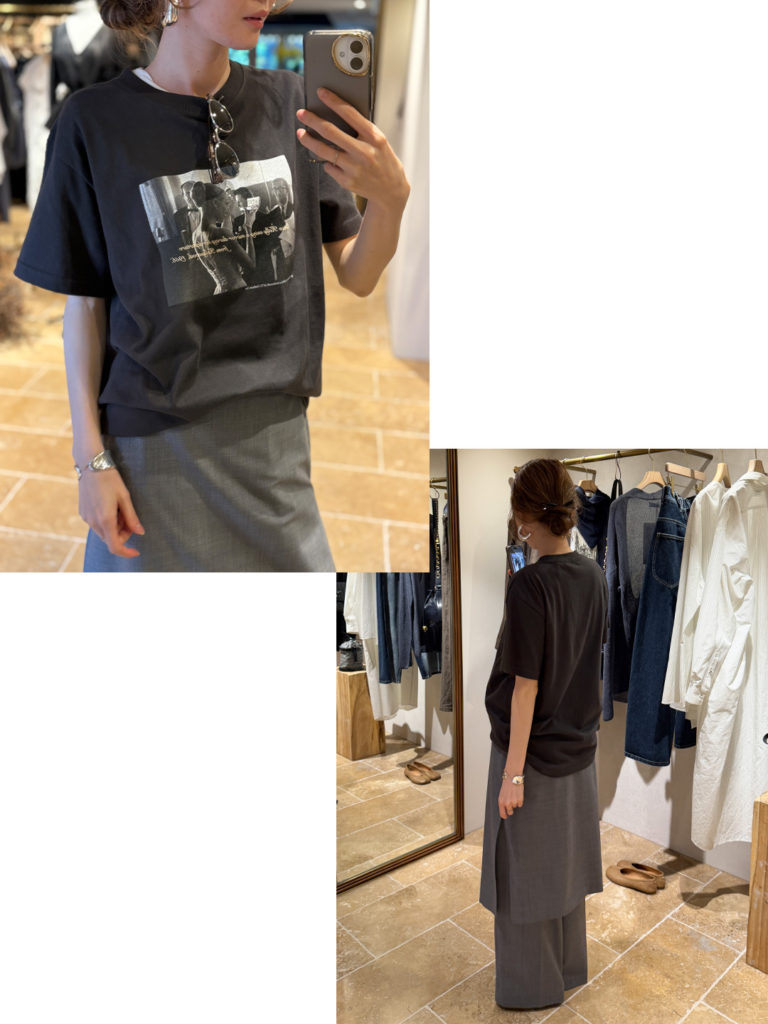 毎年大好評のLIFE別注フォトTシャツ。今年もカレンソロジーらしい素敵な写真をセレクトしました♡カジュアルなTシャツに、キレイめのウール素材のボトムスを合わせてスタイリッシュに着たい気分。パンツ単品のワンツーコーデも素敵ですが、同素材のスカートを重ねて今年らしいレイヤードのバランスに。