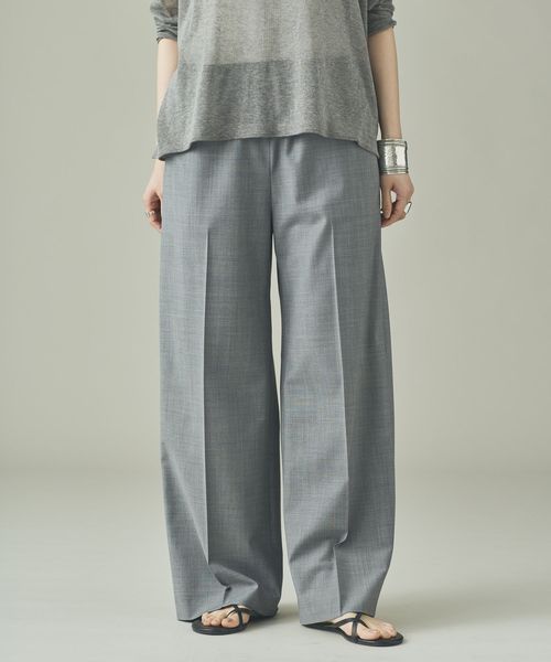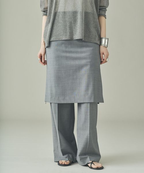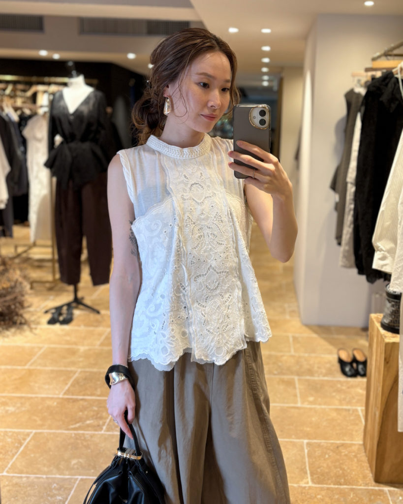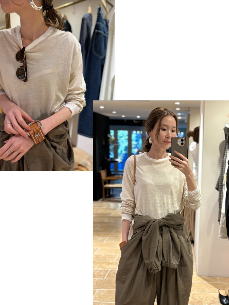 私はあえてインナーにノースリーブをレイヤードしてカジュアルな要素を加えました。ボトムはボリュームのあるドロストパンツを合わせるのが、私も大好きなカレンソロジーらしいバランスです。
