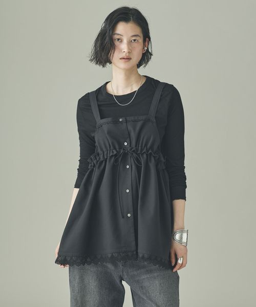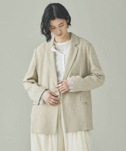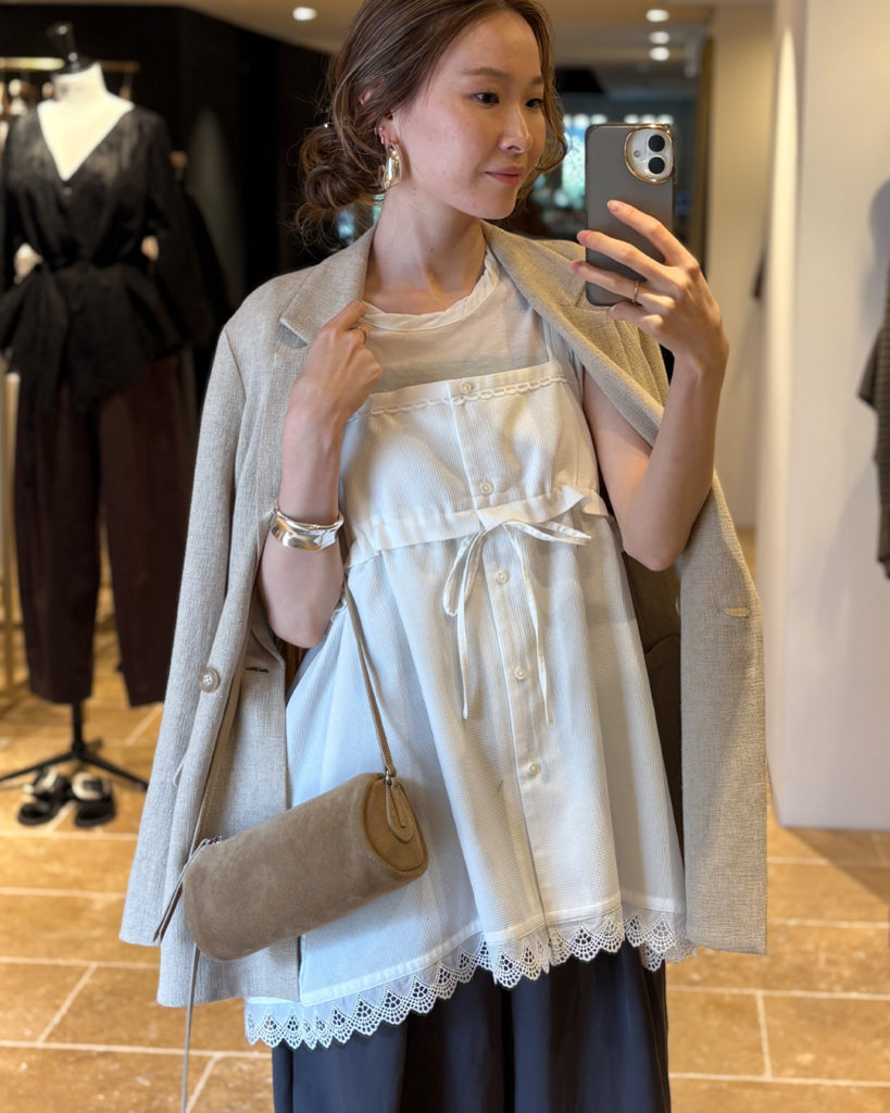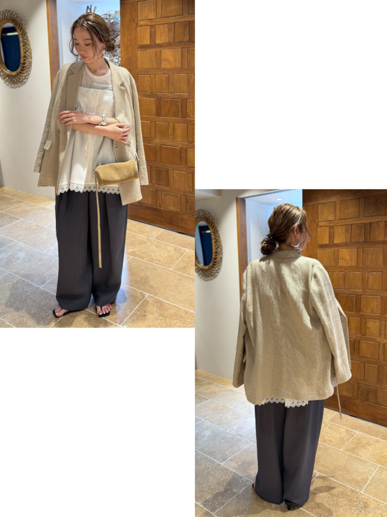 ワッフル素材とフェミニンなレースが可愛い甘めなキャミソールに、あえてマニッシュなタックパンツを合わせて、大人のフェミニンスタイルに。ジャケットをバサッと肩にかけて、甘さとハンサムさの絶妙なバランスを意識しました。