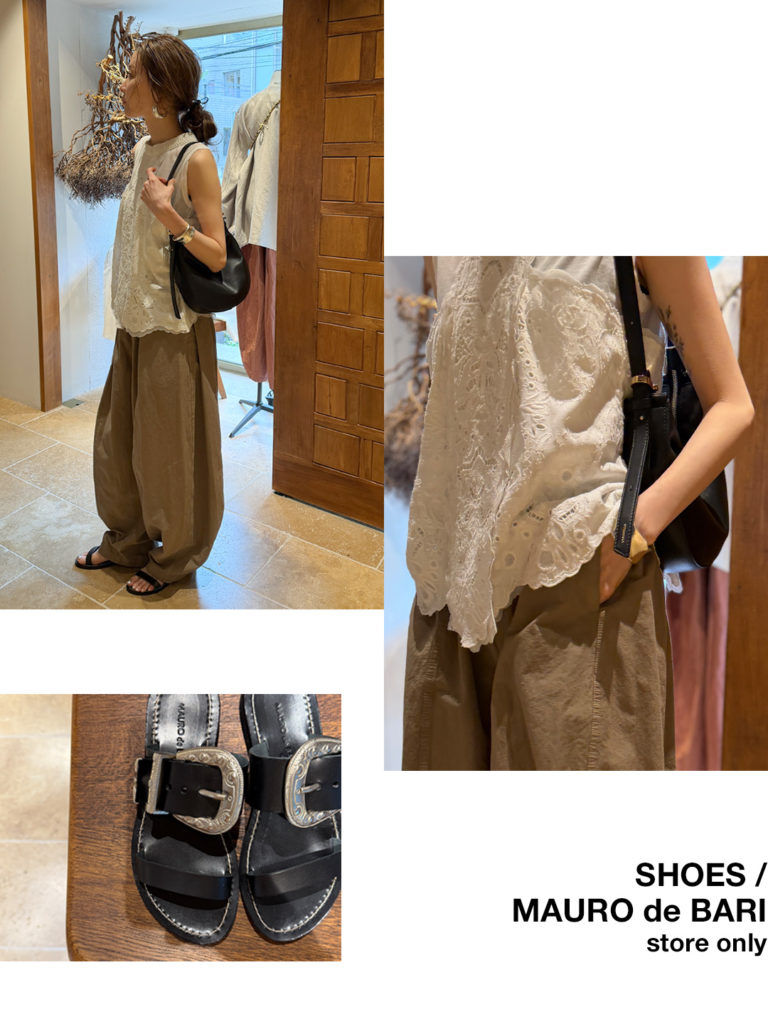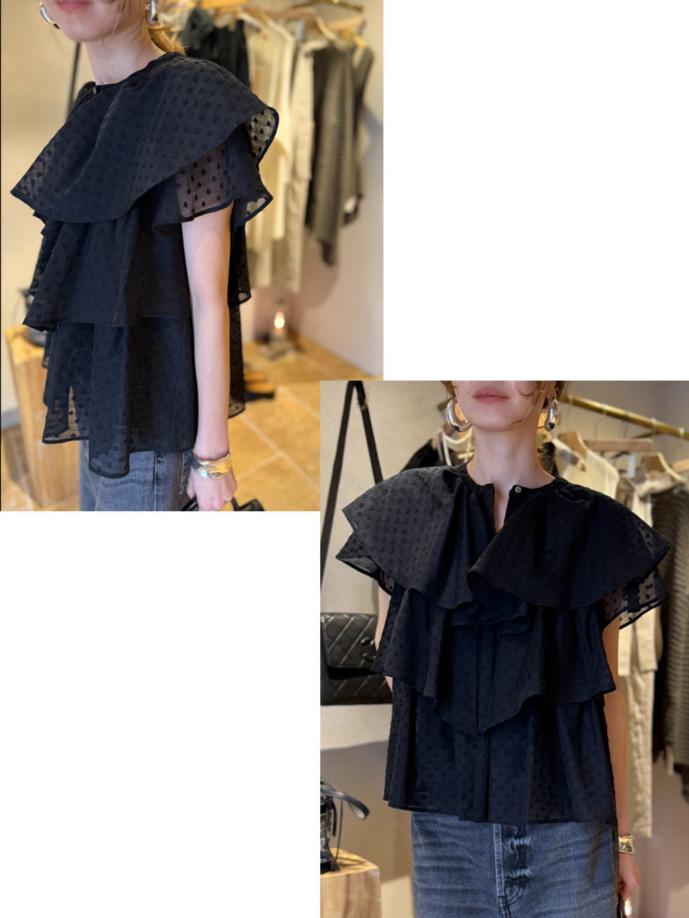 袖を通した瞬間リアルバイ決定♡ SSの立ち上がりでも大人気だったラミーフリルブラウスに新色が追加。裁ち切りのニュアンスが甘すぎず、ラミー素材特有のツヤとシワ感もこなれ感を演出。定番のルーズデニムを合わせて抜け感をだしつつ、絶妙な丈感を楽しみました。