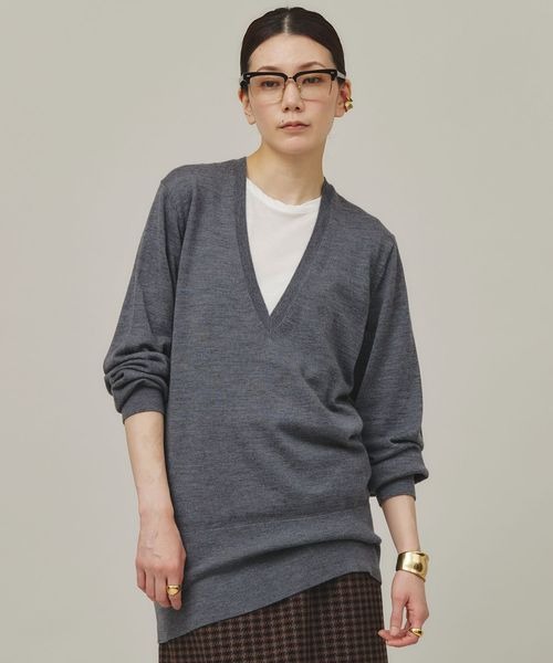 深めのVネックが印象的な一着。重ね着もしやすく、スタイリングの幅が広がるアイテムです。