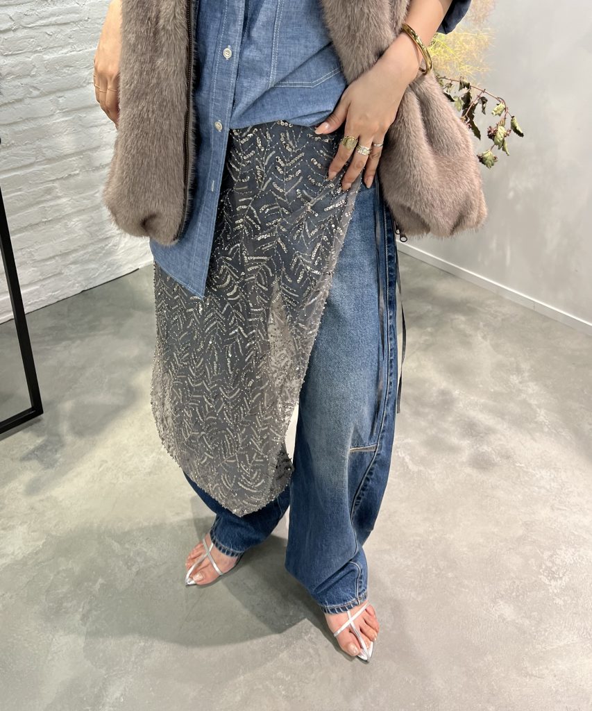 กระโปรง: [สั่งจองล่วงหน้า]กระโปรงผ้าทูลล์ประดับลูกปัดแบบพันรอบตัว