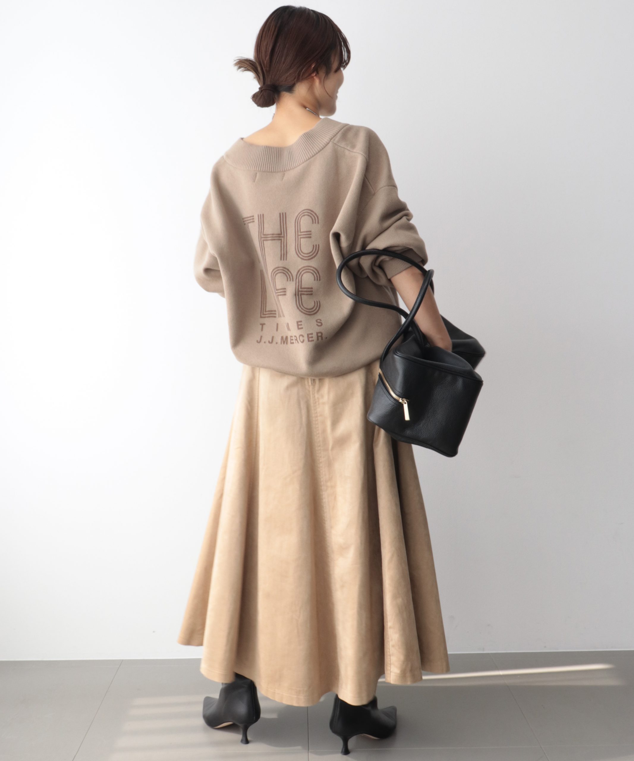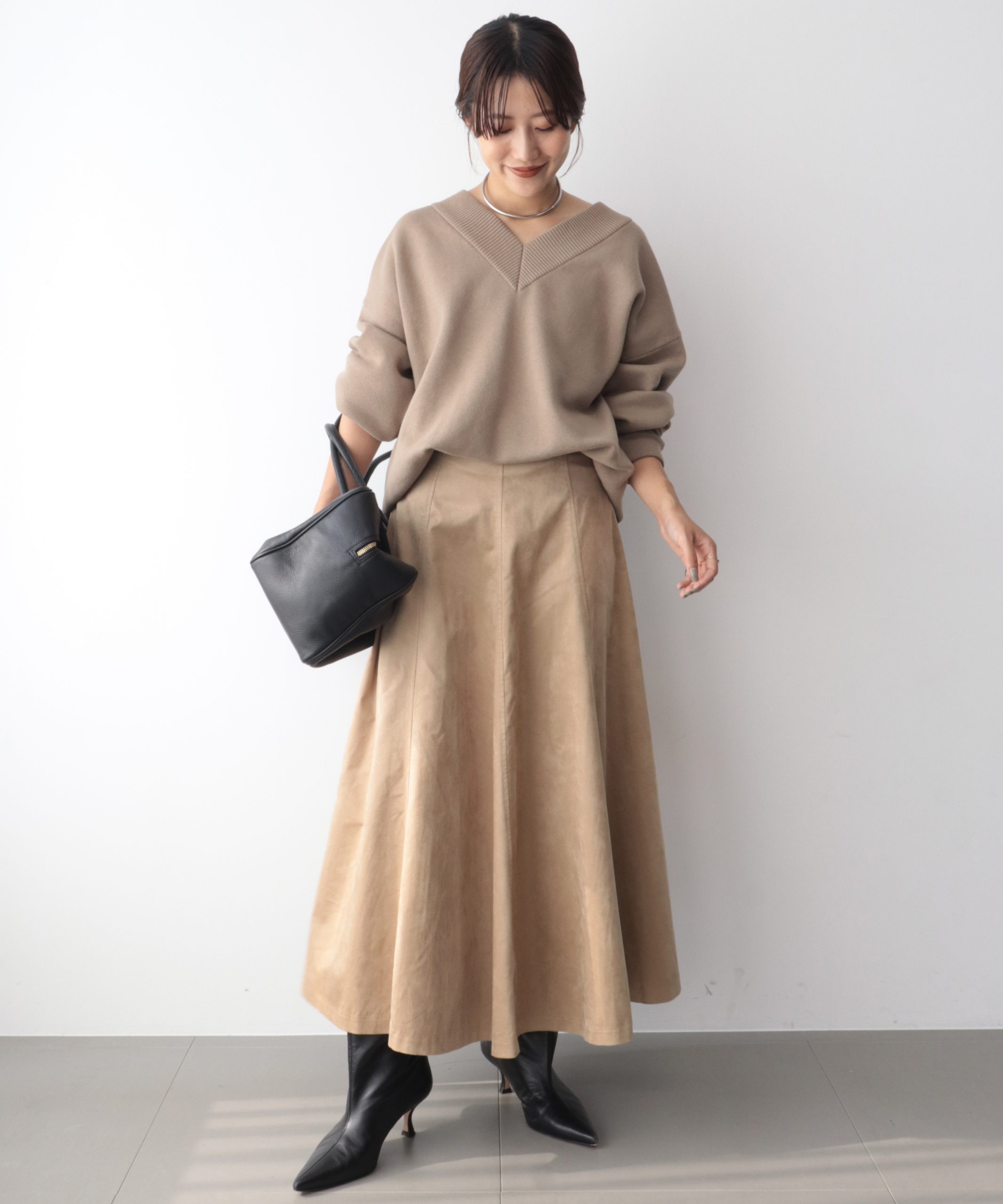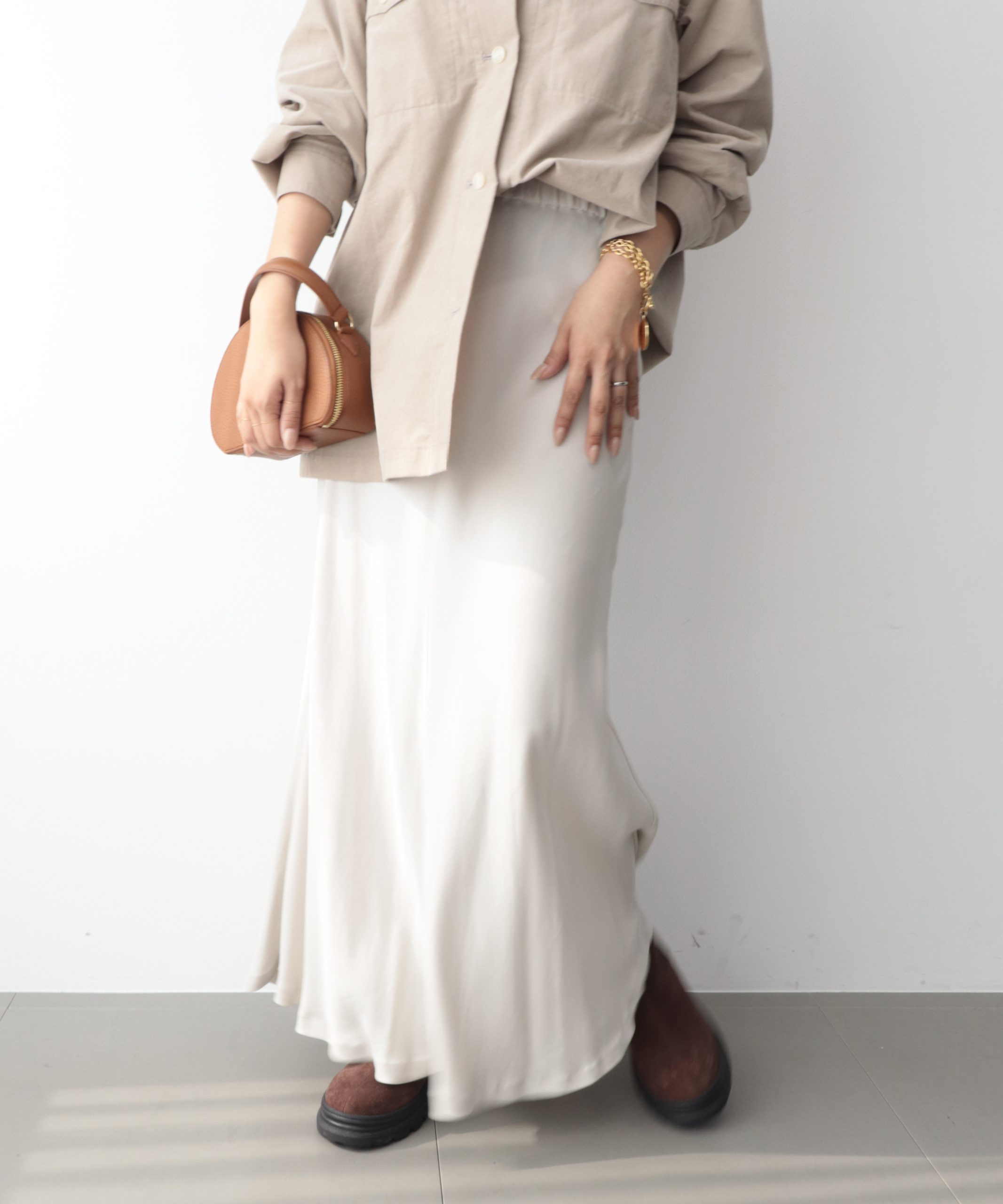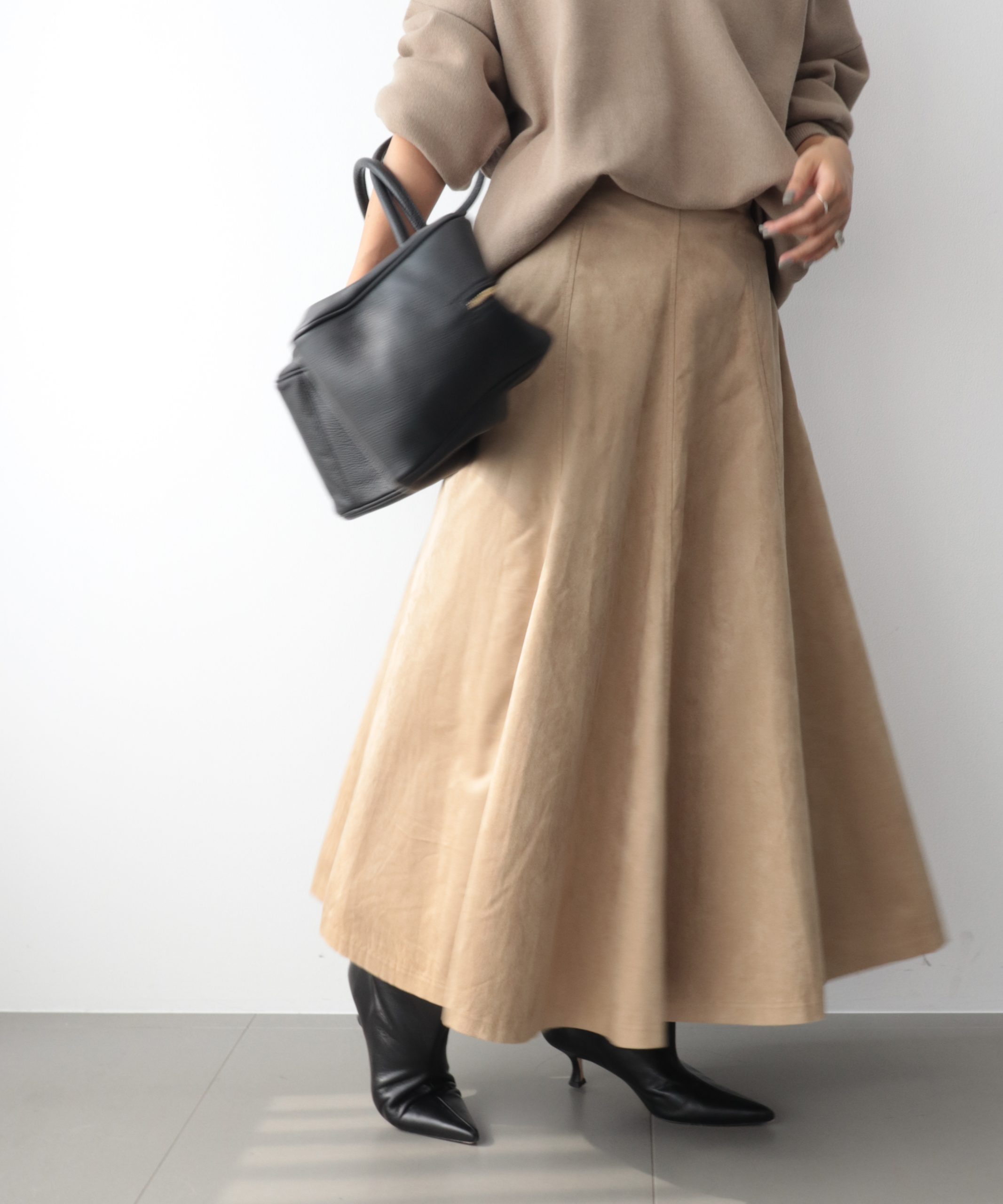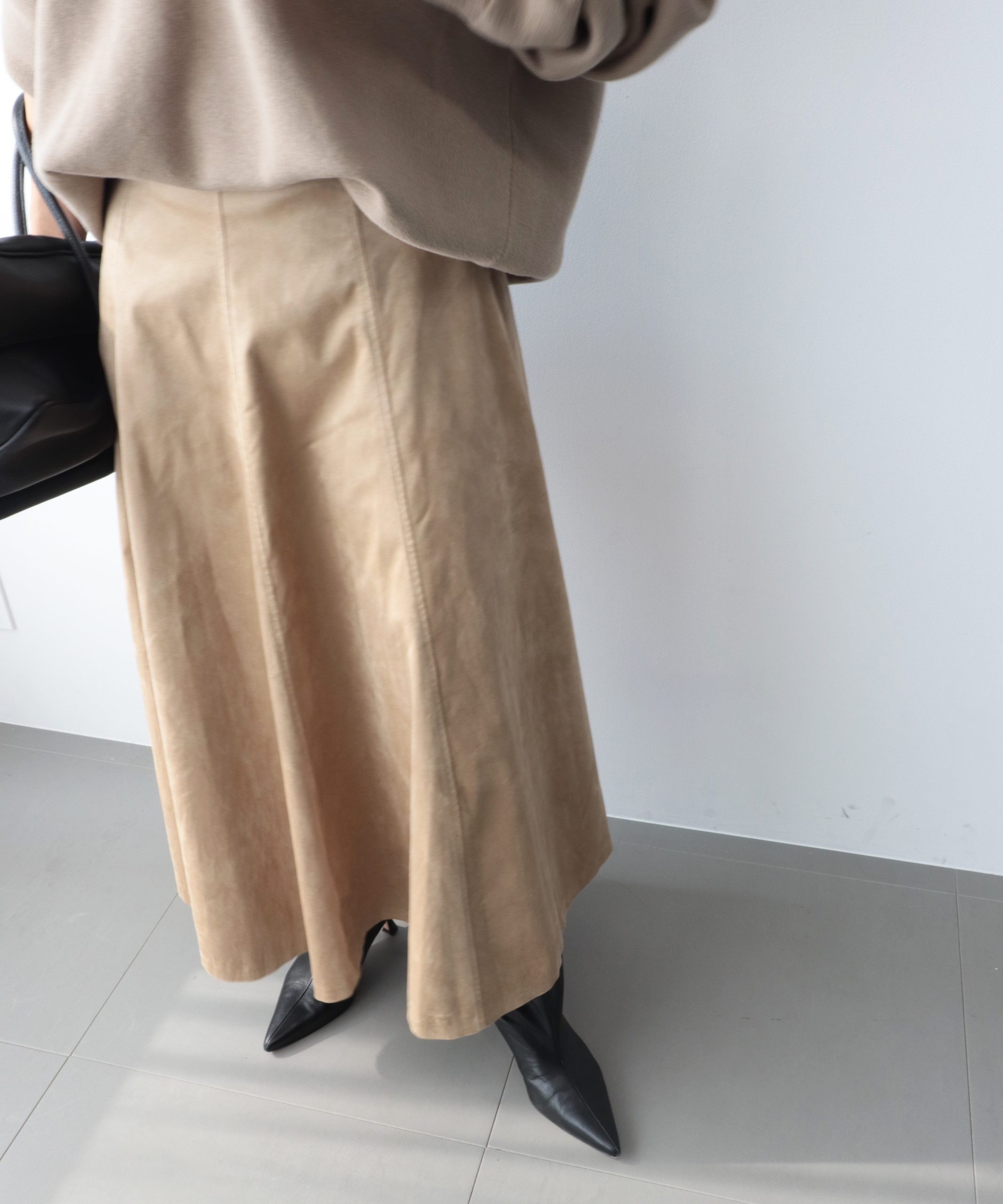 ไอเท็มเรียบง่ายแต่ทันสมัยชิ้นนี้ ผสานเทรนด์ผ้าหนังกลับที่กำลังมาแรง เข้ากับกระโปรงทรงบาน