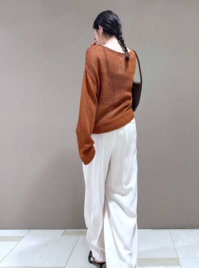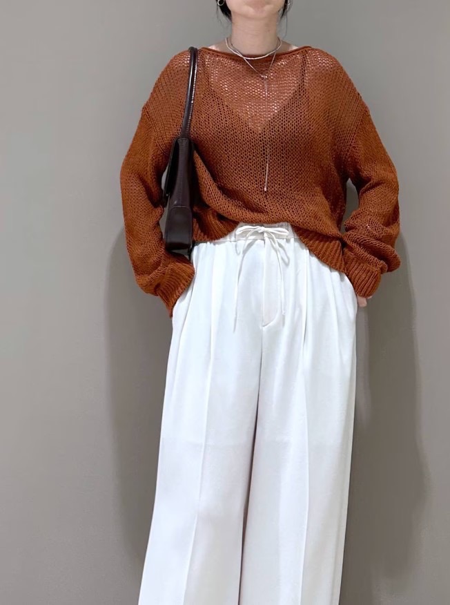 ชุดสุดเก๋ชิ้นนี้ผสมผสานผ้าไหมถักเนื้อบางยอดนิยมในสีใหม่เข้ากับกางเกงสีสดใส เหมาะสำหรับช่วงเปลี่ยนฤดู! ผ้าถักโปร่งเป็นสีน้ำตาลอมส้มเข้ม ให้ความรู้สึกเหมือนฤดูใบไม้ร่วงอย่างแท้จริง! เนื้อผ้าโปร่งเบา ไม่รู้สึกหนักผิว และสีก็เข้ากับกางเกงสีอะไรก็ได้ง่าย ^ ^ วัสดุผ้าไหม 100% ทำให้สวมใส่สบายได้ตลอดทั้งปี