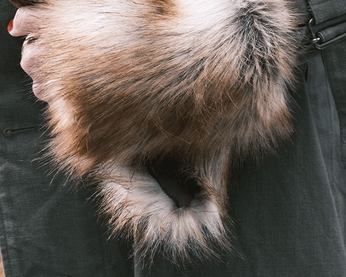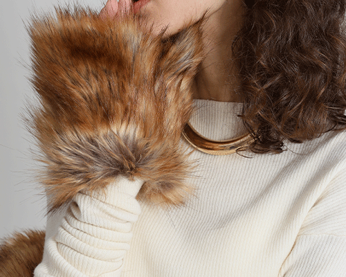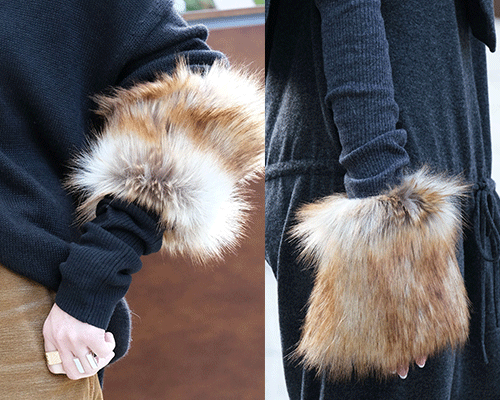 ส่วนที่เป็นผ้าถักทำด้วยสีเดียวกับเสื้อสเวตเตอร์คอเรือ ขนแรคคูนเย็บติดเหมือนข้อมือ ขนนั้นนุ่มมากจนคุณไม่มีทางเดาได้เลยว่าเป็นขนเทียม เนื่องจากคุณสมบัติของวัสดุ อาจมีสีแตกต่างกันเล็กน้อยในแต่ละชิ้น แต่สีพื้นฐานของขนจะคงที่ นอกจากนี้ยังมีช่องสำหรับให้มือขยับได้ ทำให้สวมใส่สบาย