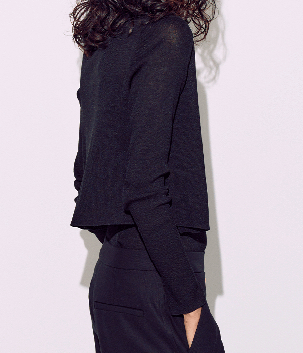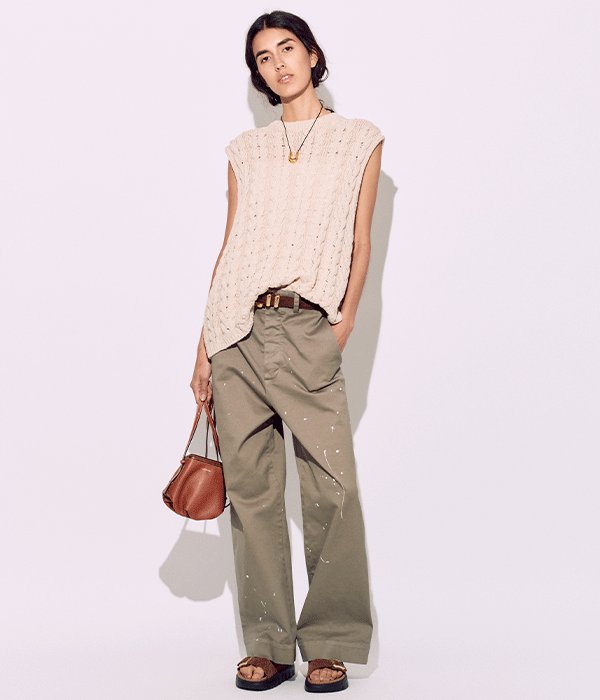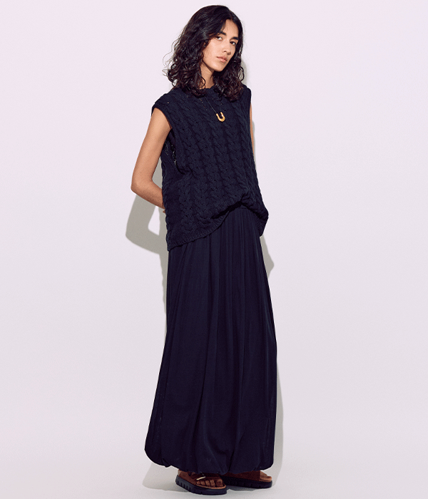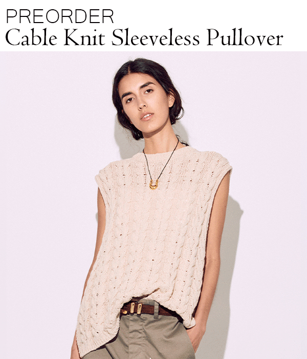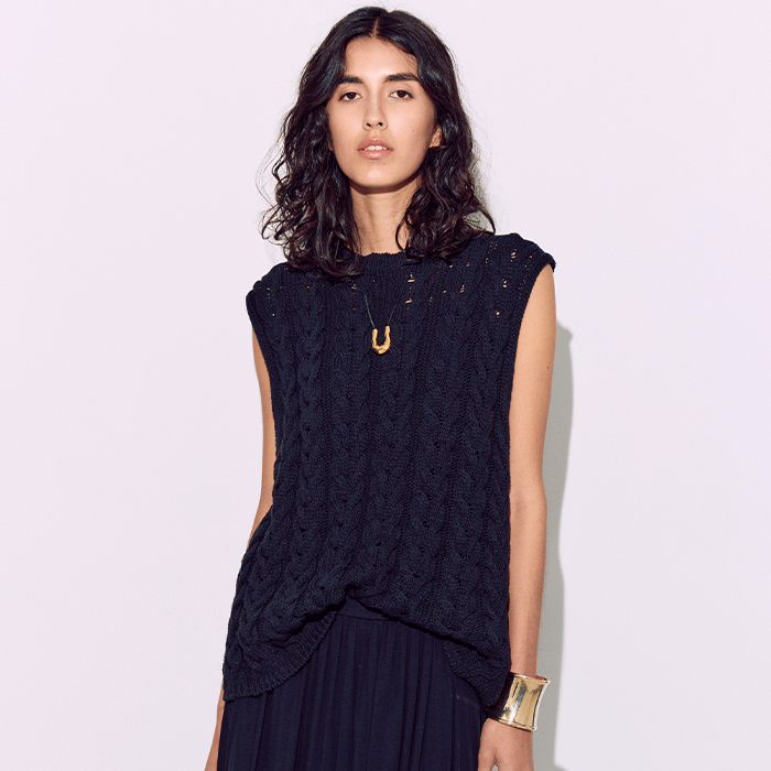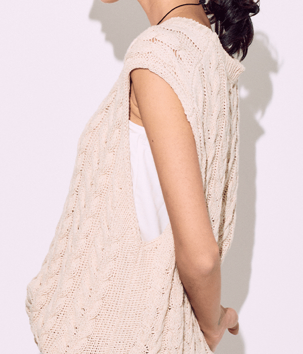 การถักลายเคเบิลสามมิติและรูปทรงที่เข้ารูปช่วงไหล่อย่างเป็นธรรมชาติ ทำให้เสื้อตัวนี้ดูสมดุลและเผยผิวอย่างเรียบร้อยแม้จะเป็นเสื้อแขนกุดก็ตาม