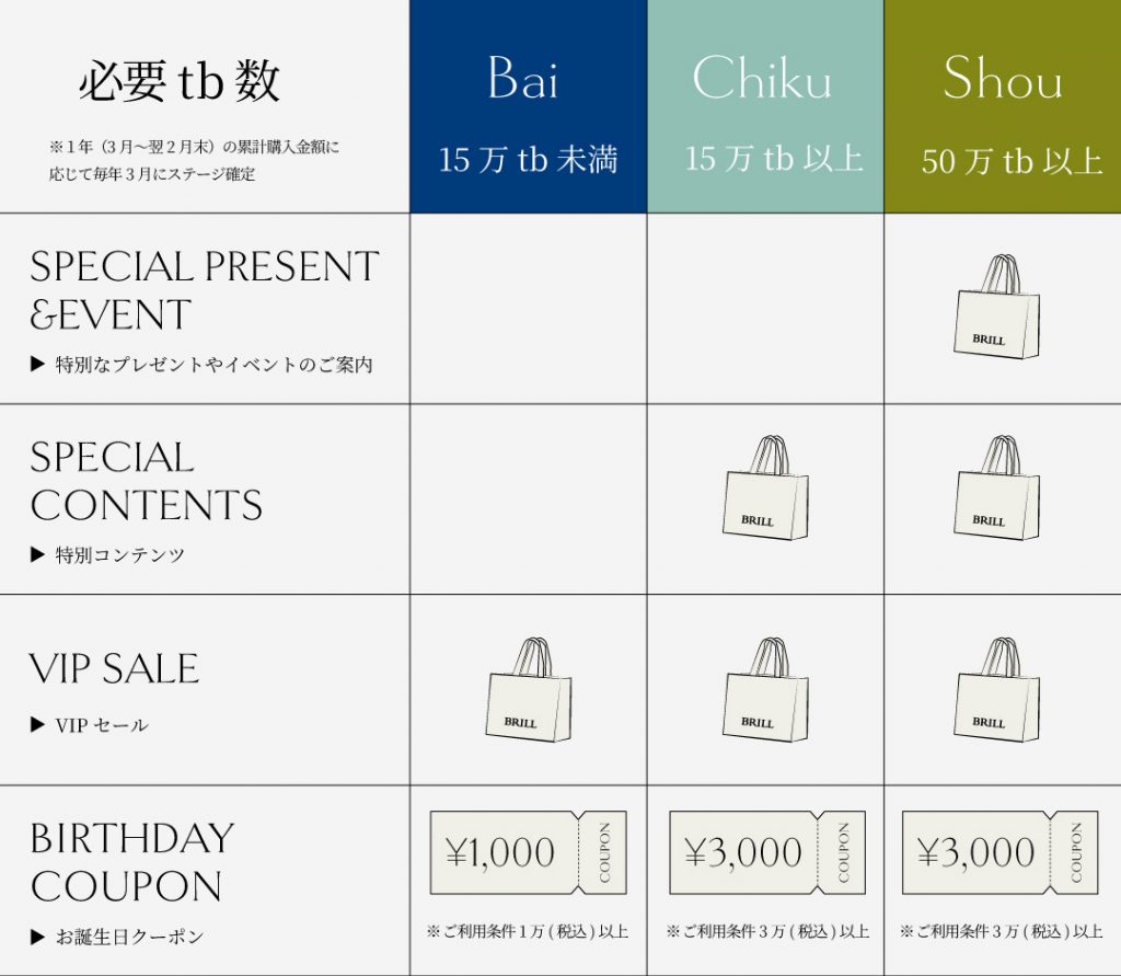 สำหรับแต่ละช่วงทั้งสามช่วง (โช่ว, ชิคุ, ไป๋) เรามอบสิทธิประโยชน์และบริการพิเศษที่สามารถใช้ได้ที่ร้าน BRILL และร้านค้าออนไลน์