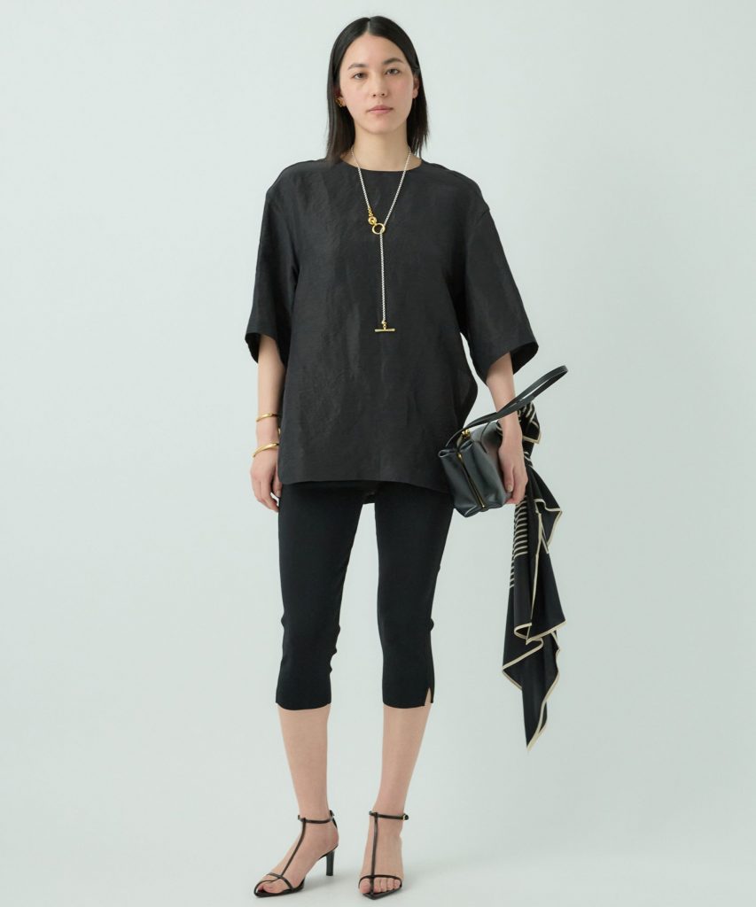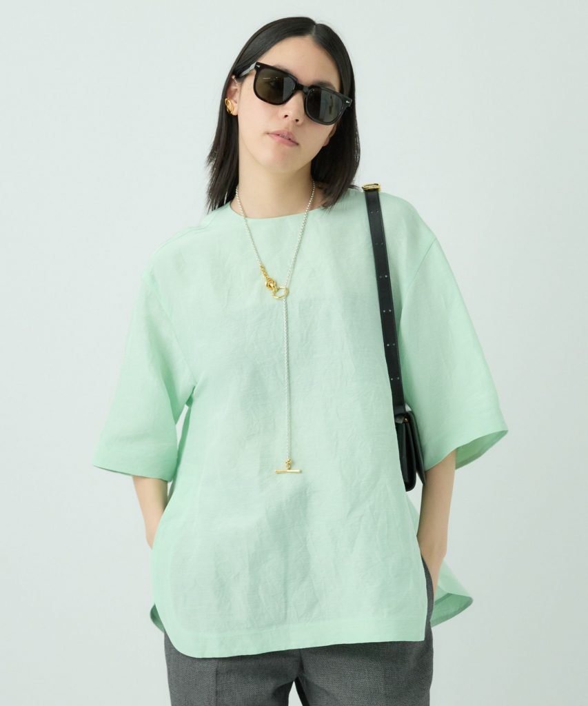 เสื้อแขนสั้นเรียบง่ายที่ทำจากผ้าลินินไหมทอเรียบคุณภาพสูง แสดงให้เห็นถึงฝีมือการตัดเย็บที่ประณีตที่สุด