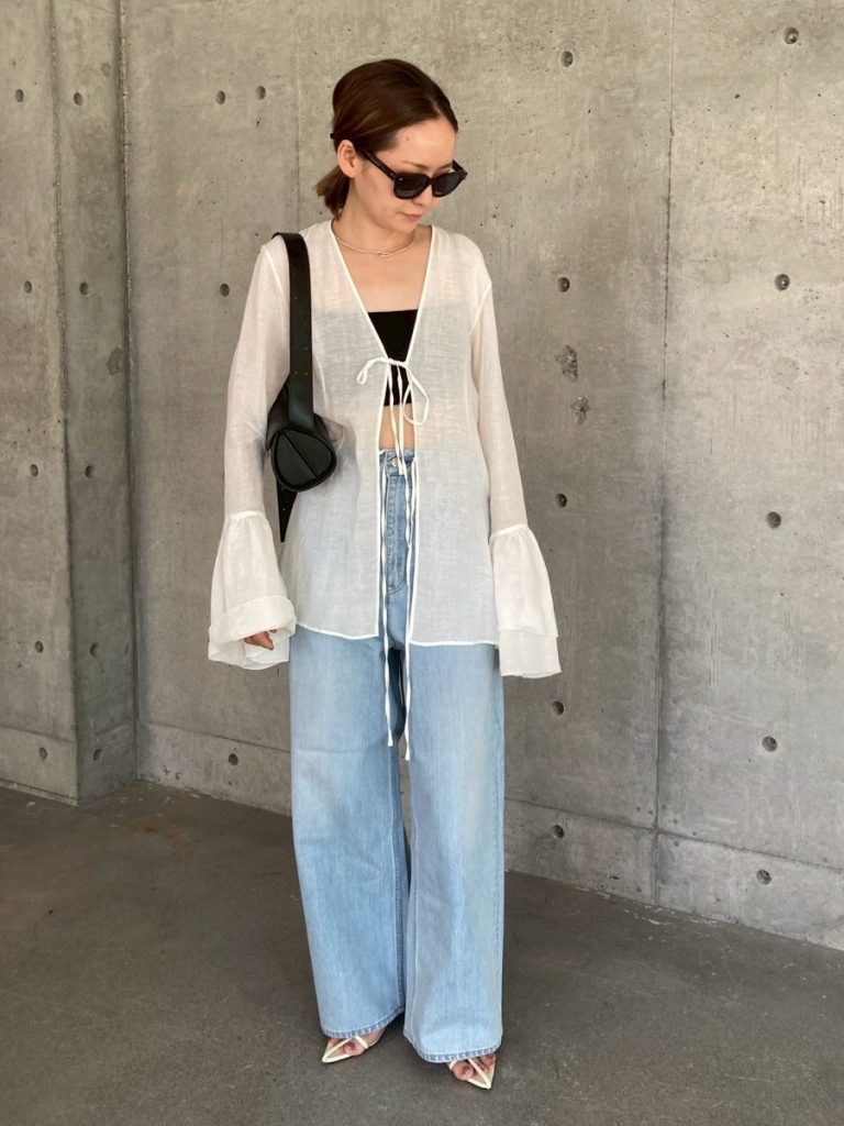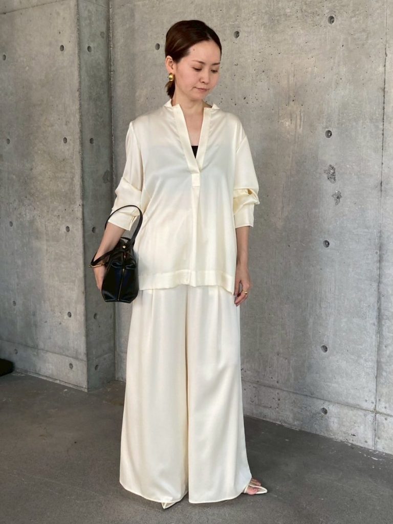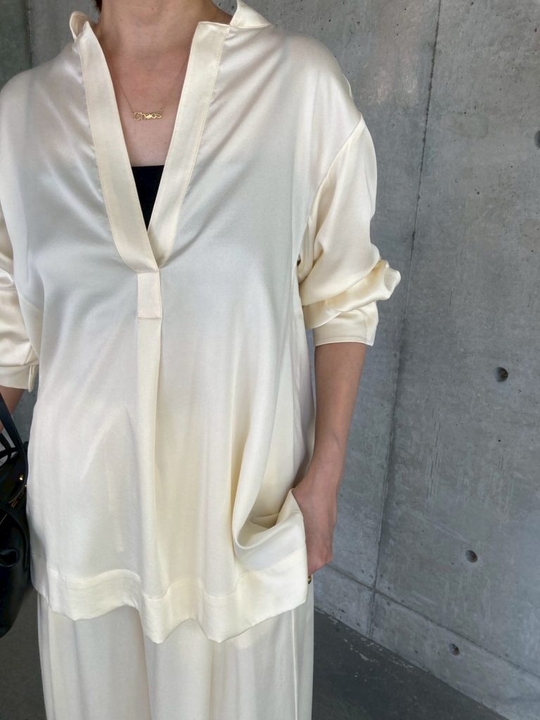เสื้อเบลาส์ทรงกัปตันเรือให้ลุคที่ดูหรูหราด้วยการเปิดเผยบริเวณคอเล็กน้อย