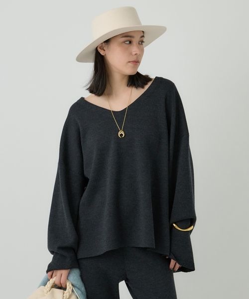 เสื้อตัวนี้มีคอวีทรงหลวมขนาดใหญ่