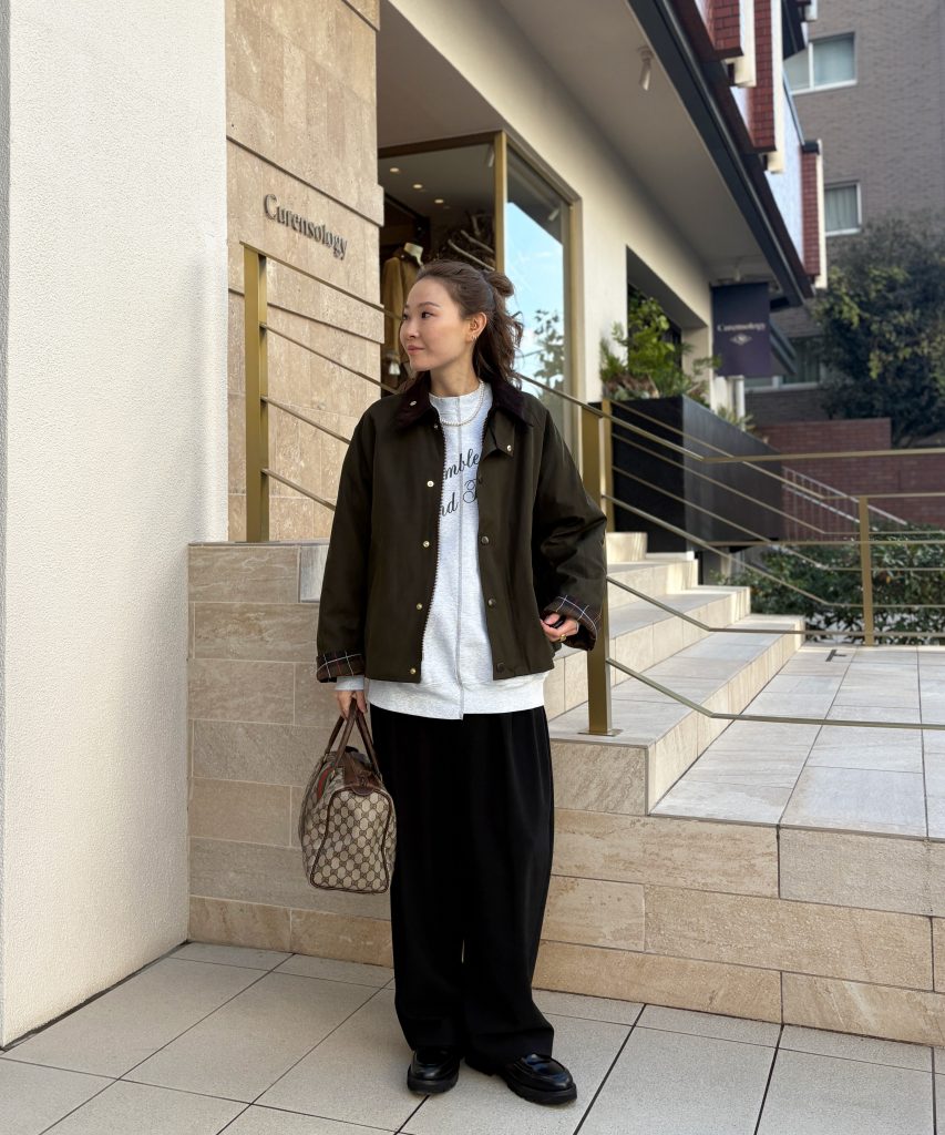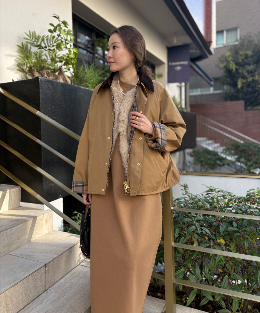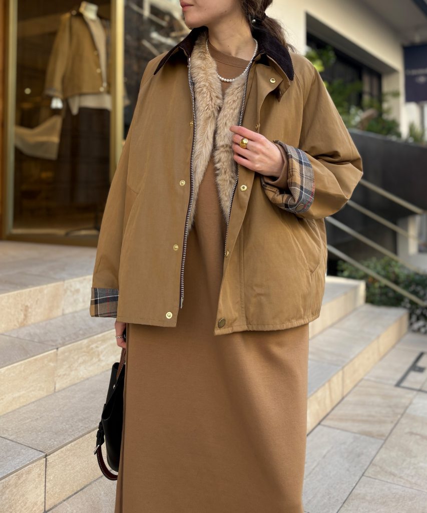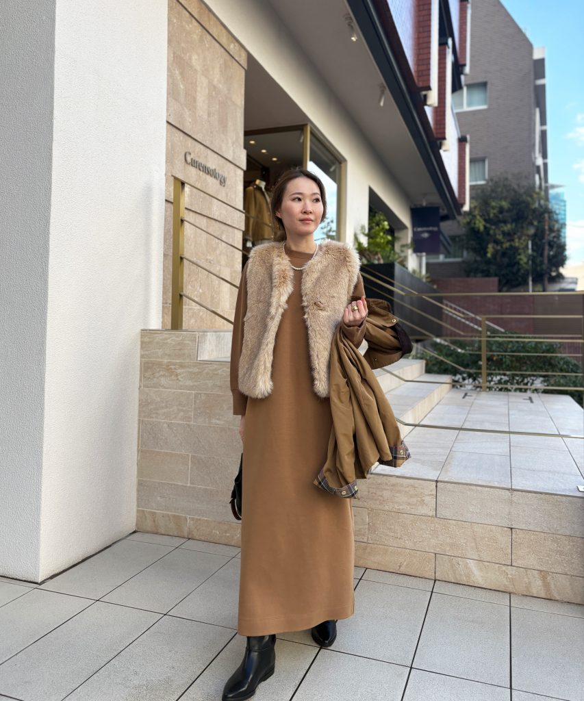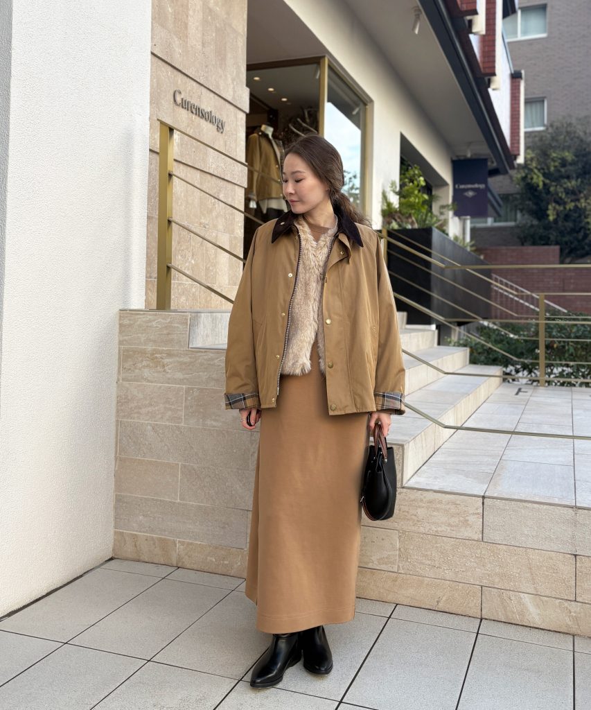 ขอแนะนำลุคเรียบหรูโทนสีเดียวที่ลงตัวสำหรับการออกไปเที่ยวในช่วงเทศกาลวันหยุด เมื่อเมืองเต็มไปด้วยดอกไม้บานสะพรั่ง ♪ ชุดพื้นฐานคือเดรสทรงไอไลน์ "Cardboard Dress" รุ่นใหม่ ที่เรียบง่ายและสะอาดตา มีความกระชับกำลังดี ไม่ทำให้เห็นสัดส่วนชัดเจน และใส่สบายจนสามารถนั่งได้นาน เหมาะสำหรับมื้อกลางวันหรือมื้อเย็น การสวมทับด้วยเสื้อกั๊กขนสัตว์สุดหรูจะช่วยยกระดับบรรยากาศของเทศกาลได้ทันที เสื้อตัวนอกเป็นแจ็คเก็ต Karen Soroj ที่ตัดเย็บพิเศษโดย Barbour แขนเสื้อกว้างทำให้ไม่ดูเทอะทะแม้จะสวมทับเสื้อกั๊กขนสัตว์ตัวใหญ่ สร้างลุคที่ดูเรียบหรูและทันสมัย ◎ ซิปด้านหน้าและตัวดึงซิปเป็นสีทองและสีเงินผสมกัน เพิ่มประกายระยิบระยับราวกับเครื่องประดับแม้ภายใต้แสงไฟ รองเท้าบูทช่วยเติมเต็มลุคให้สมบูรณ์ ในขณะที่ซับในลายตารางของแจ็คเก็ตช่วยเพิ่มความโดดเด่น ♪