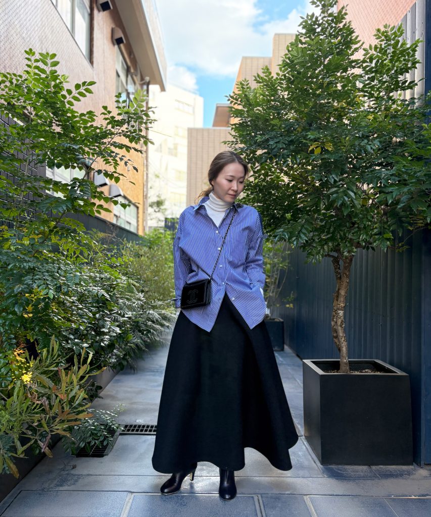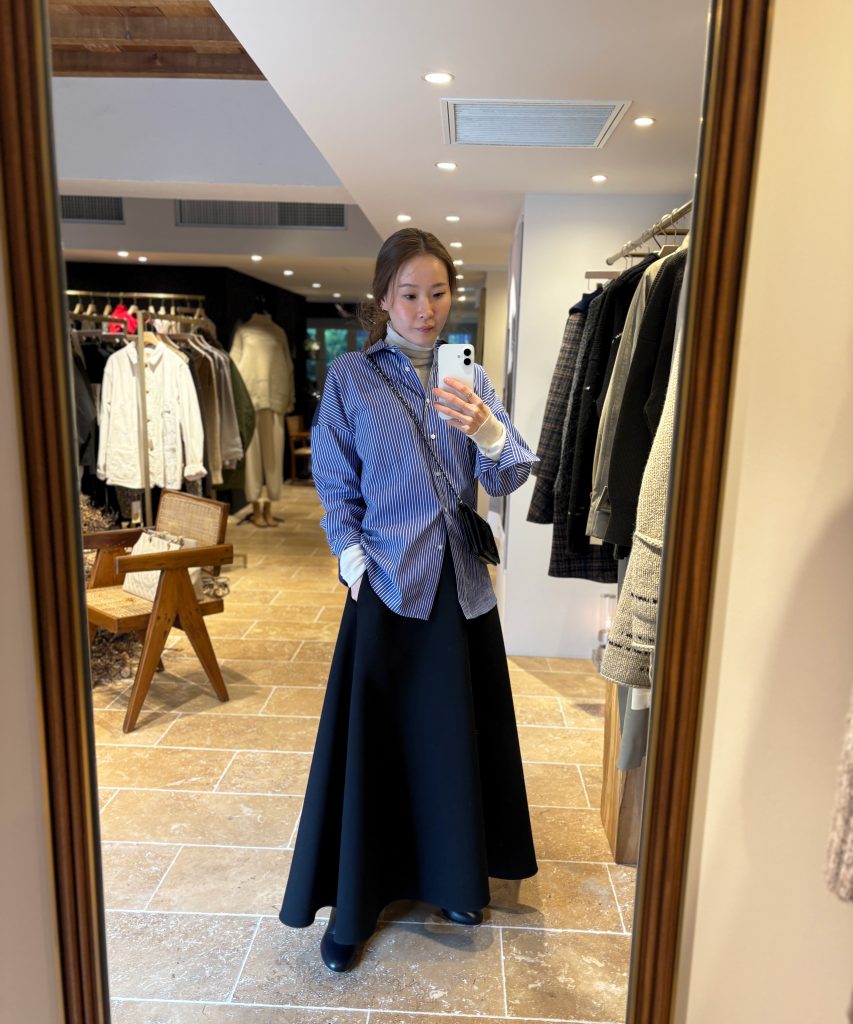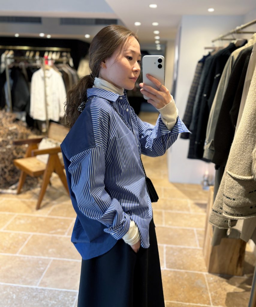 เสื้อเชิ้ตลายทางผสมยอดนิยมของเรา ที่เคยเปิดให้สั่งจองล่วงหน้า ตอนนี้พร้อมจำหน่ายแล้ว! ♪ ดีไซน์ลายทางสุดเก๋นี้ โดดเด่นด้วยความแตกต่างของเฉดสีและลวดลายระหว่างด้านหน้าและด้านหลัง เนื้อผ้าคอตตอนป๊อปลินความหนาแน่นสูงให้ความกระชับกำลังดี สร้างรูปทรงสามมิติที่สวยงาม ครั้งนี้ลองใส่คู่กับเสื้อคอเต่าสีขาวด้านในเพื่อลุคอบอุ่นที่เหมาะกับฤดูหนาว สำหรับกางเกง เราจับคู่กับกระโปรงผ้าขนสัตว์แบบใหม่ของเรา ที่มีทรงบานสวยงาม ความหนาของผ้าสร้างรูปทรงที่ดูมีโครงสร้างและบานออก ให้ความรู้สึกแข็งแรง แต่เบาและสบายอย่างน่าประหลาดใจ ใส่แบบลำลองโดยไม่ต้องใส่ชายเสื้อไว้ในกางเกง เพื่อลุคที่ดูดีมีสไตล์และสง่างาม