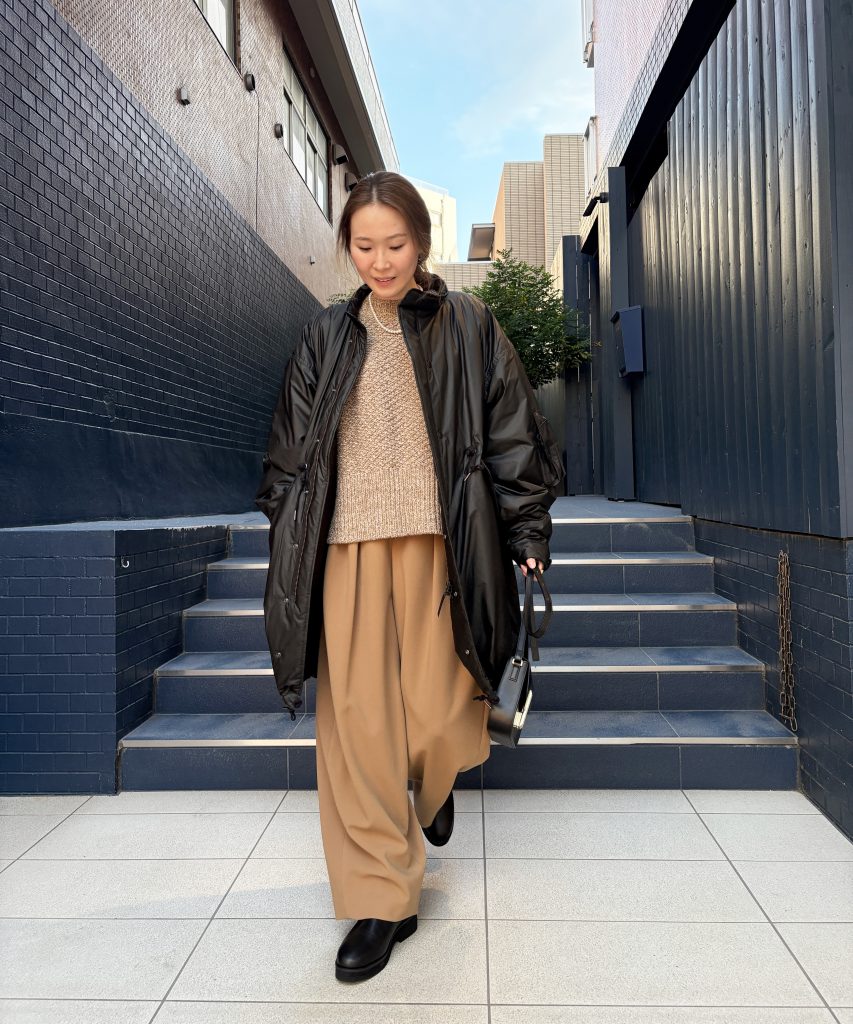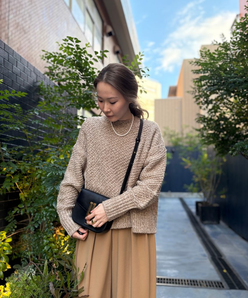 สไตล์การแต่งตัวนี้โดดเด่นด้วยเสื้อสเวตเตอร์ถักรุ่นใหม่ "Kanoko Ami MIX Knit Pullover" ที่มีเนื้อสัมผัสที่น่าดึงดูดใจชวนให้นึกถึงเสื้อถักสไตล์วินเทจ ผลิตจากวัสดุสองชนิดที่แตกต่างกัน และตกแต่งด้วยลวดลาย "kanoko knit" ที่สร้างพื้นผิวขรุขระ ทำให้เสื้อตัวนี้ดูมีมิติและมีเสน่ห์แม้จะสวมใส่เพียงตัวเดียว เสื้อถักตัวนี้มีความโดดเด่น จึงมั่นใจได้ว่าจะกลายเป็นจุดเด่นของชุดของคุณ ครั้งนี้เราจับคู่กับกางเกง "Double Cross Two-Tuck Pants" ที่มีให้เลือกในสีเบจใหม่ เพื่อสร้างชุดโทนเดียวที่อบอุ่นและดูเป็นผู้ใหญ่ ชุดสีเบจที่มักจะดูน่าเบื่อจะเปลี่ยนเป็นสไตล์ที่ดูหรูหราและเฉียบคมด้วยเนื้อสัมผัสสามมิติของเสื้อถักและเครื่องประดับสีดำ