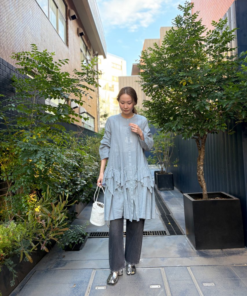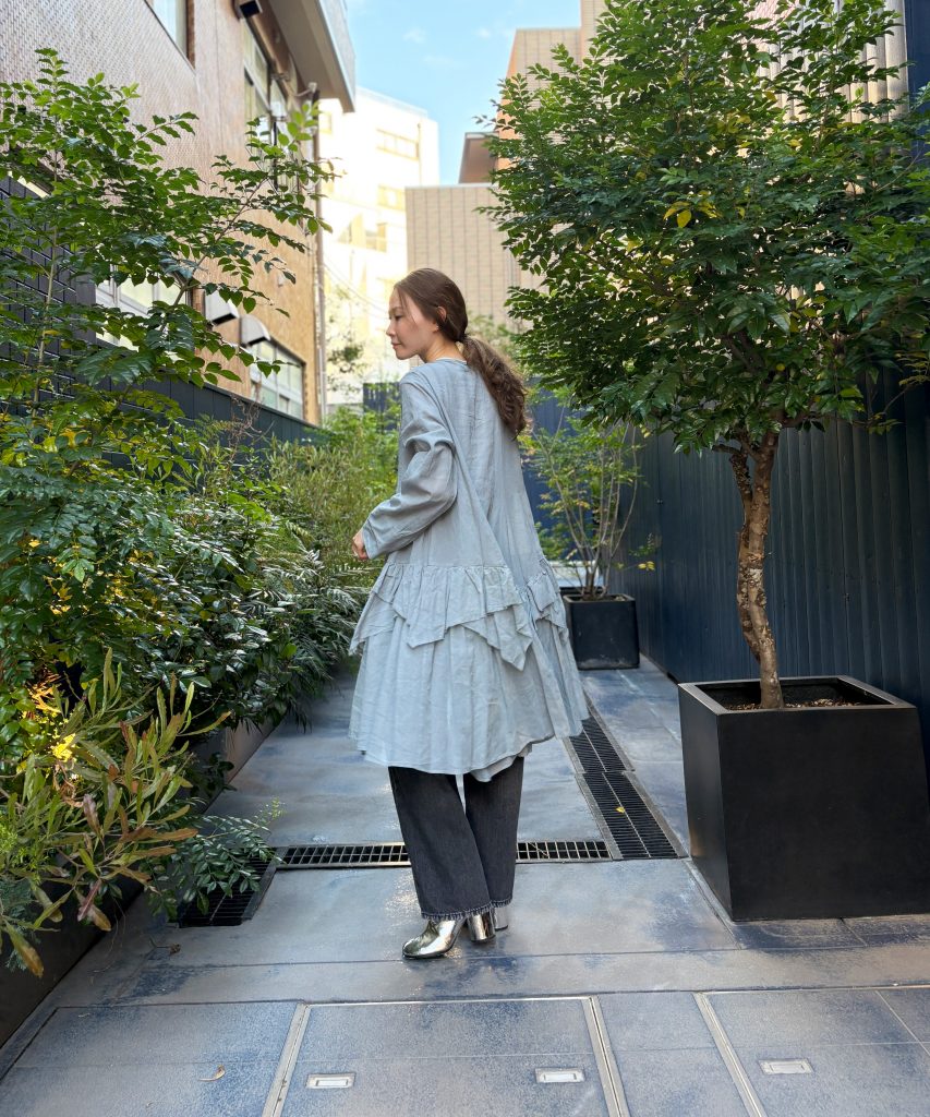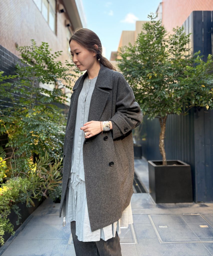 เสื้อทูนิกตัวใหม่ที่เข้ากันได้ดีกับโค้ทมาถึงแล้ว ♪ ระบายที่ตัดเย็บอย่างไม่เป็นระเบียบช่วยสร้างลุคที่ดูสบายๆ แต่หรูหราโดยไม่หวานจนเกินไป เธอสวมโค้ทผ้าเมลตัน ซึ่งเพิ่งนำกลับมาขายอีกครั้งในเดือนธันวาคม ทำจากวัสดุผ้าเมลตันขนสัตว์คุณภาพสูง น้ำหนักเบา ทรงสวย สวมทับเสื้อถักเนื้อบางเบาได้ง่าย ครั้งนี้ระบายโผล่ออกมาจากชายเสื้อโค้ท เพิ่มความเบาให้กับชุดกันหนาวที่มักจะดูหนัก การผสมผสานสีเทาและสีฟ้าอ่อนที่ดูสง่างามและมีสไตล์ เสริมด้วยรายละเอียดสีเงินที่ปลายเท้า