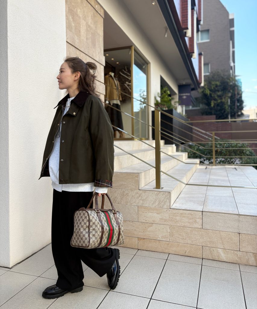ต่อไป เราจะมาโชว์สไตล์วินเทจที่โดดเด่นด้วยแจ็คเก็ตรุ่นพิเศษ Karen Soroj สีกากีจาก Barbour เมื่อจับคู่กับเสื้อสเวตเตอร์มีโลโก้ด้านใน จะได้ลุคแคชชวลที่ดูเท่และมีสไตล์ การพับปลายแขนเสื้อขึ้นเพื่อเผยให้เห็นลายตารางหมากรุกด้านใน ช่วยเพิ่มความคลาสสิกและทำให้รู้สึกสบายมือ ส่วนกางเกงเป็นสีดำ และรองเท้าโลฟเฟอร์ทรงใหญ่ช่วยเสริมลุคแมนๆ ปิดท้ายด้วยกระเป๋า Boston Bag สไตล์วินเทจ ช่วยสร้างลุคที่ดูหรูหราและสง่างามแม้ในโอกาสสบายๆ