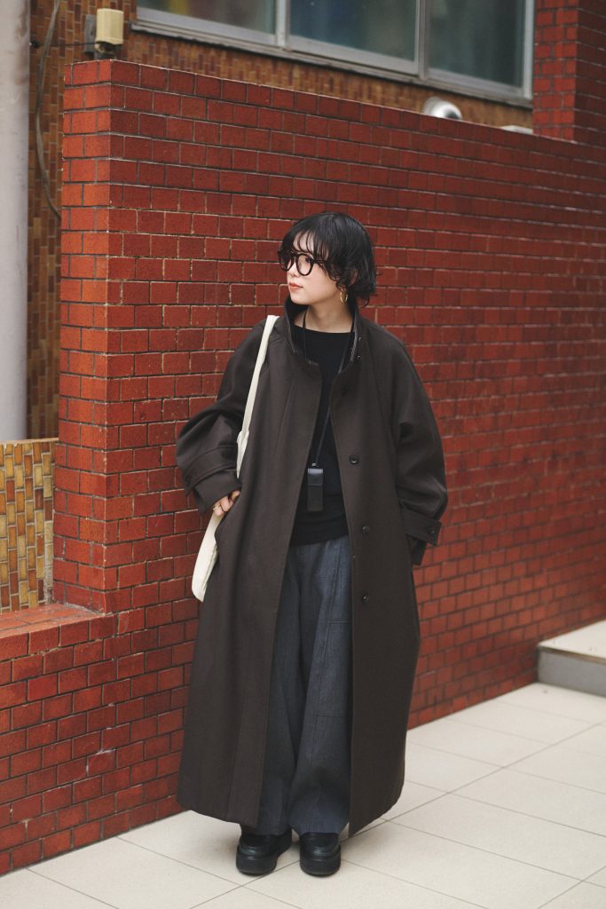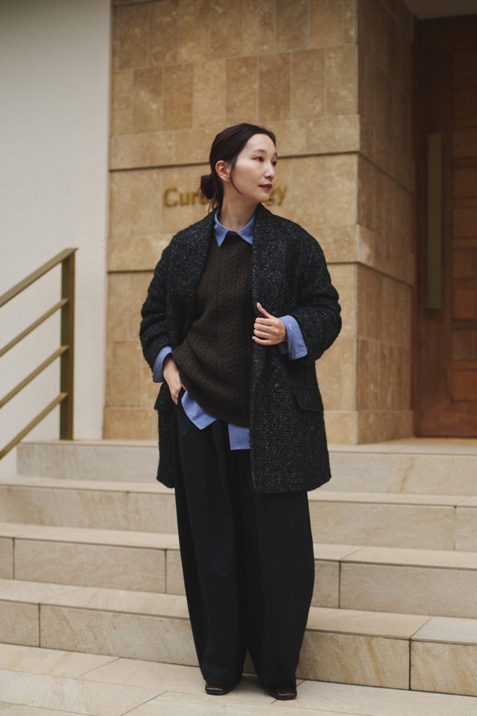 สไตล์แมนๆ ที่เปี่ยมด้วยกลิ่นอายของฤดูกาล ผสมผสานเสื้อคลุมผ้าทวีดที่โดดเด่นเข้ากับเสื้อไหมพรมถักสีน้ำตาลเข้ม แม้จะเป็นการผสมผสานวัสดุที่ค่อนข้างหนา แต่เสื้อเชิ้ตสีฟ้าสดใสที่อยู่ด้านในช่วยเน้นให้ดูเบาลง สร้างลุคที่ดูฉลาดและผ่อนคลาย รองเท้าเงาวาวช่วยเสริมลุคโดยรวมให้สมบูรณ์ สร้างสไตล์เลเยอร์ที่ดูเป็นผู้ใหญ่ ซึ่งเป็นเอกลักษณ์ของ K.SHIBUYA โดยไม่ดูลำลองจนเกินไป