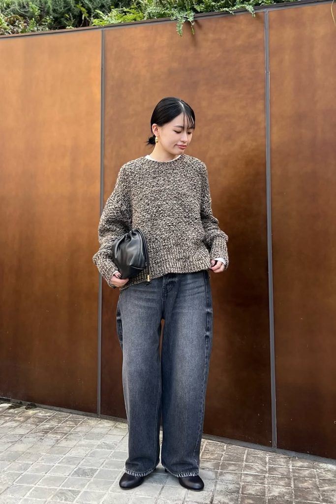 ลูกไม้ที่โผล่พ้นออกมาจากเสื้อถักสีน้ำเงินเข้มเนื้อนุ่มเข้ากับลุคอ่อนหวานของอิซูมิได้อย่างลงตัว♪ การซ้อนลูกไม้ฉลุลายละเอียดอ่อนไว้บนเสื้อถักขนยาวช่วยเพิ่มความเบาให้กับสไตล์เสื้อถักในฤดูหนาวที่มักจะดูหนาหนัก การจับคู่กับกางเกงชิโนสไตล์ผู้ชายช่วยสร้างความสมดุลที่ลงตัวโดยไม่หวานเลี่ยนจนเกินไป