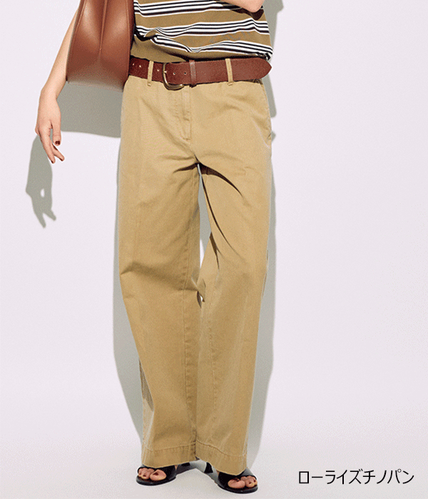 Mga low-rise na ChinoMababang taas. Dinisenyo para isuot sa baywang. May katamtamang espasyo ang mga hita habang pinapanatili ang malinaw at tuwid na linya.