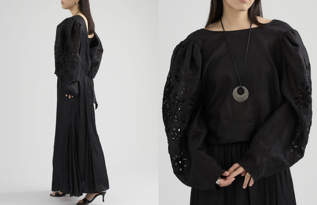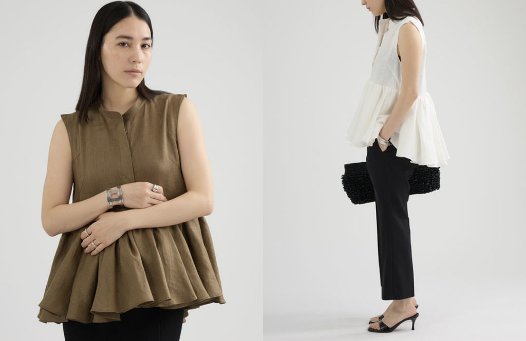Chiếc áo kiểu bắt mắt này có thiết kế bất đối xứng, gợi lên vẻ đẹp phương Đông. Nó khéo léo che phủ phần bắp tay và trông rất đẹp ngay cả khi không mặc thêm lớp áo nào khác, khiến nó trở thành món đồ không thể thiếu cho mùa sắp tới. Chất liệu cao cấp được kết hợp giữa lụa Brazil, được coi là loại lụa tốt nhất thế giới, với lụa cupra. Loại vải sản xuất trong nước này được dệt ở tỉnh Ishikawa và nhuộm ở Kyoto, thể hiện tay nghề thủ công của các nghệ nhân Nhật Bản. Vì được dệt với mật độ cao, nó không bám quá nhiều vào cơ thể và có độ rũ đẹp mắt.