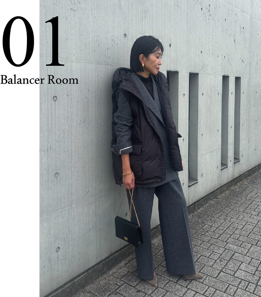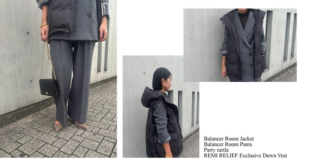 在剪裁利落的套装外叠穿一件羽绒背心,可以营造出休闲的感觉。