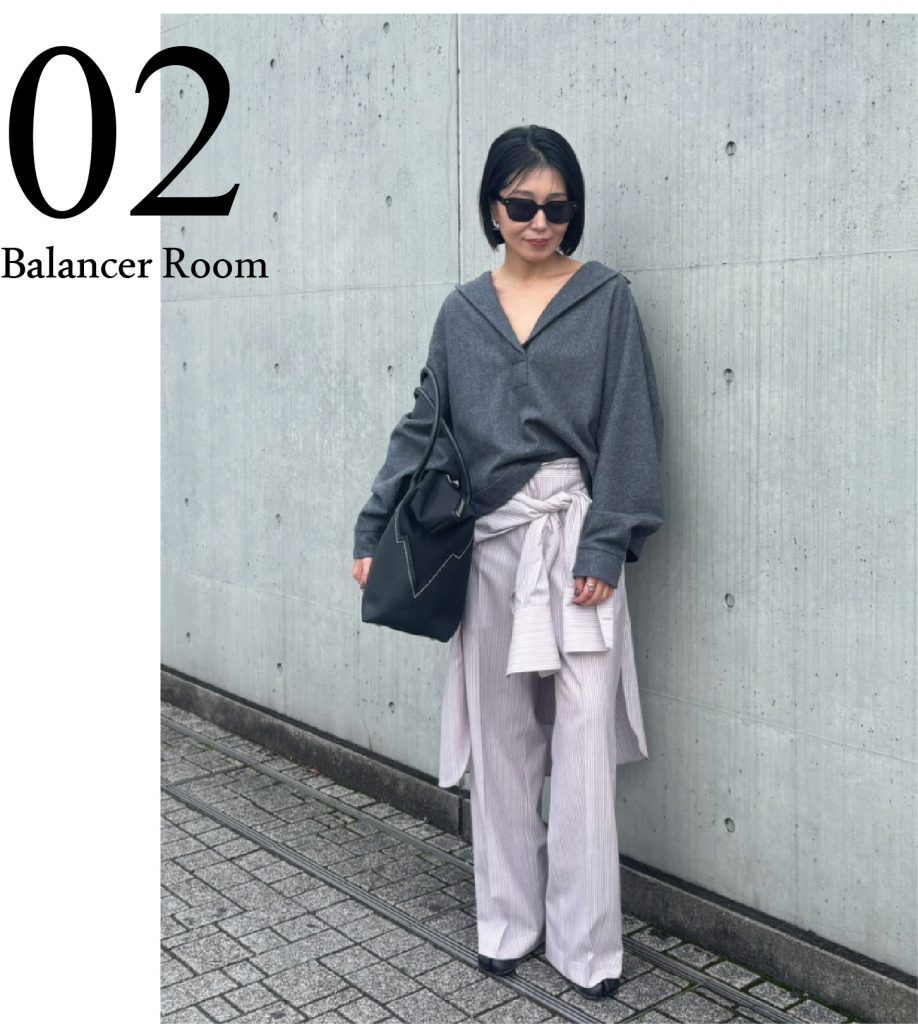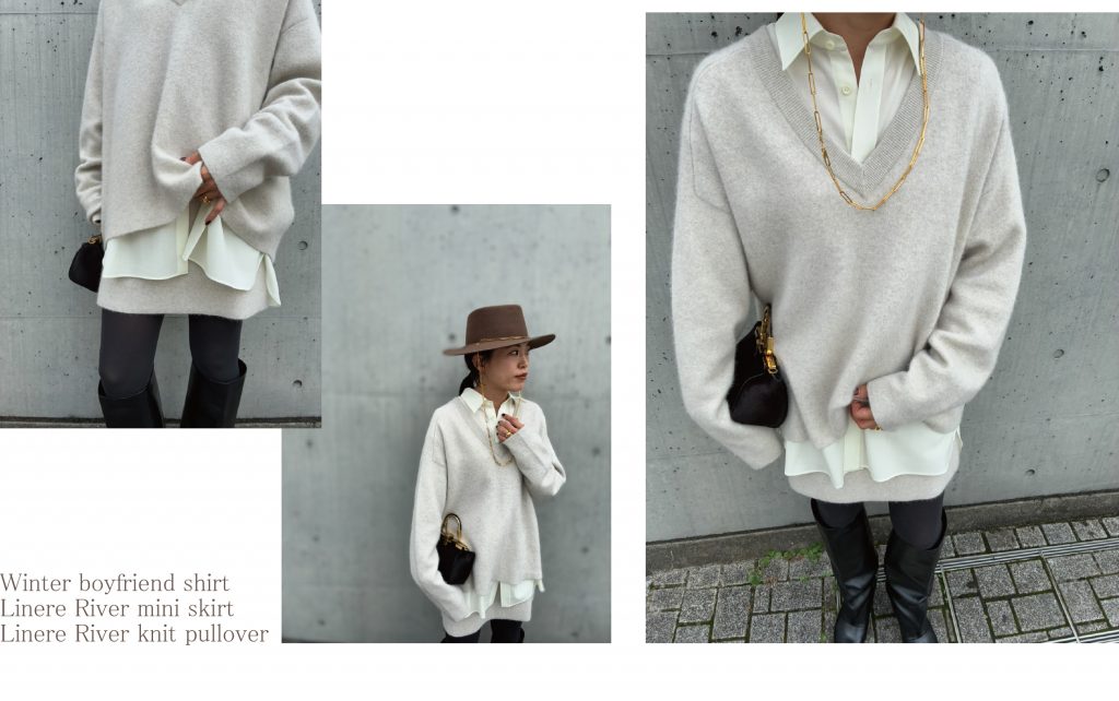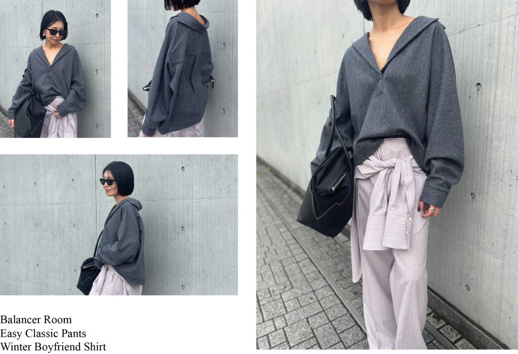 一件带有宽松船领的套头衫搭配休闲裤,既营造出休闲的氛围,又保持了整体的时尚感。