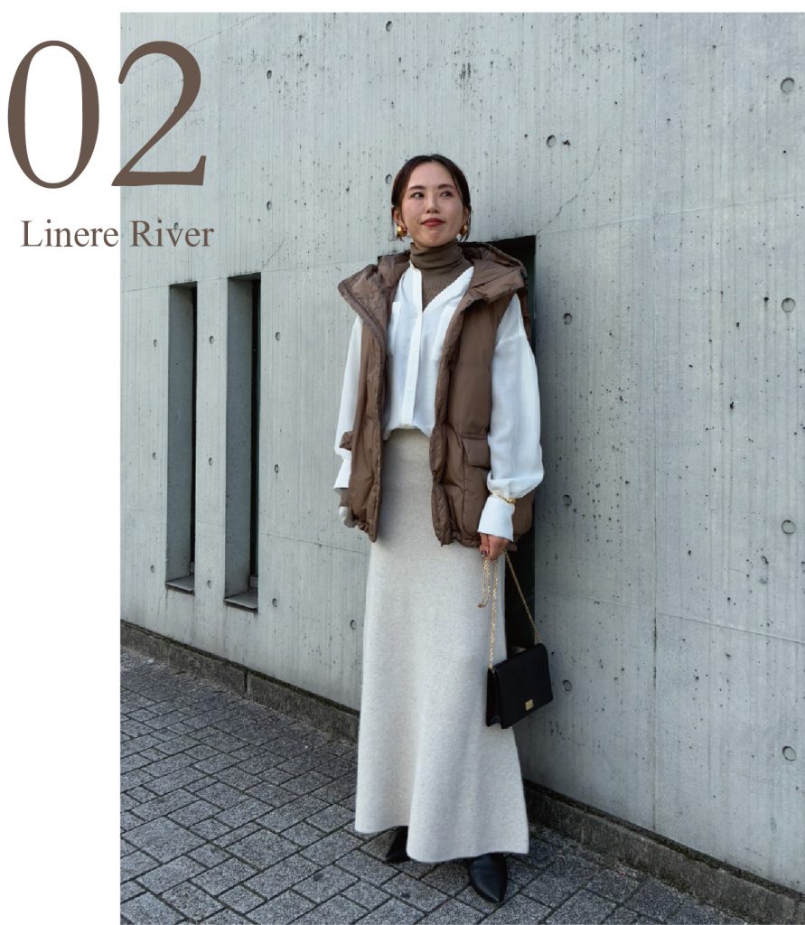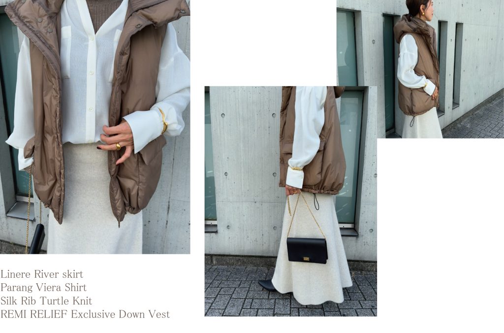 Lenny River 半身裙优雅优美的喇叭形轮廓,搭配一件略显蓬松的羽绒背心。