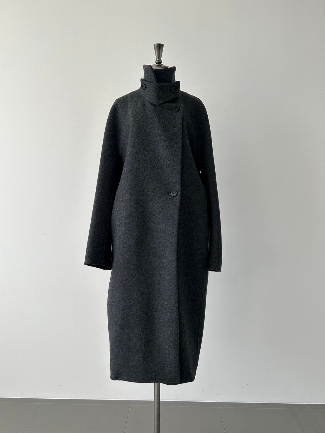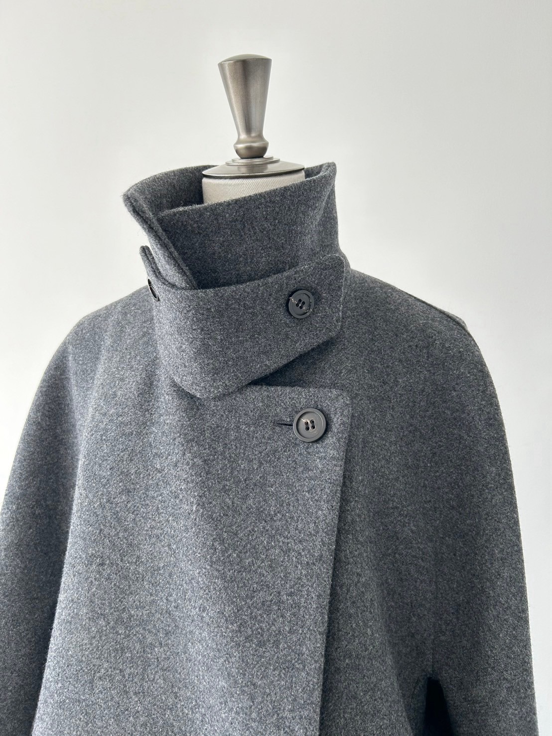 与我们之前介绍的外套不同,这款外套呈茧型轮廓。