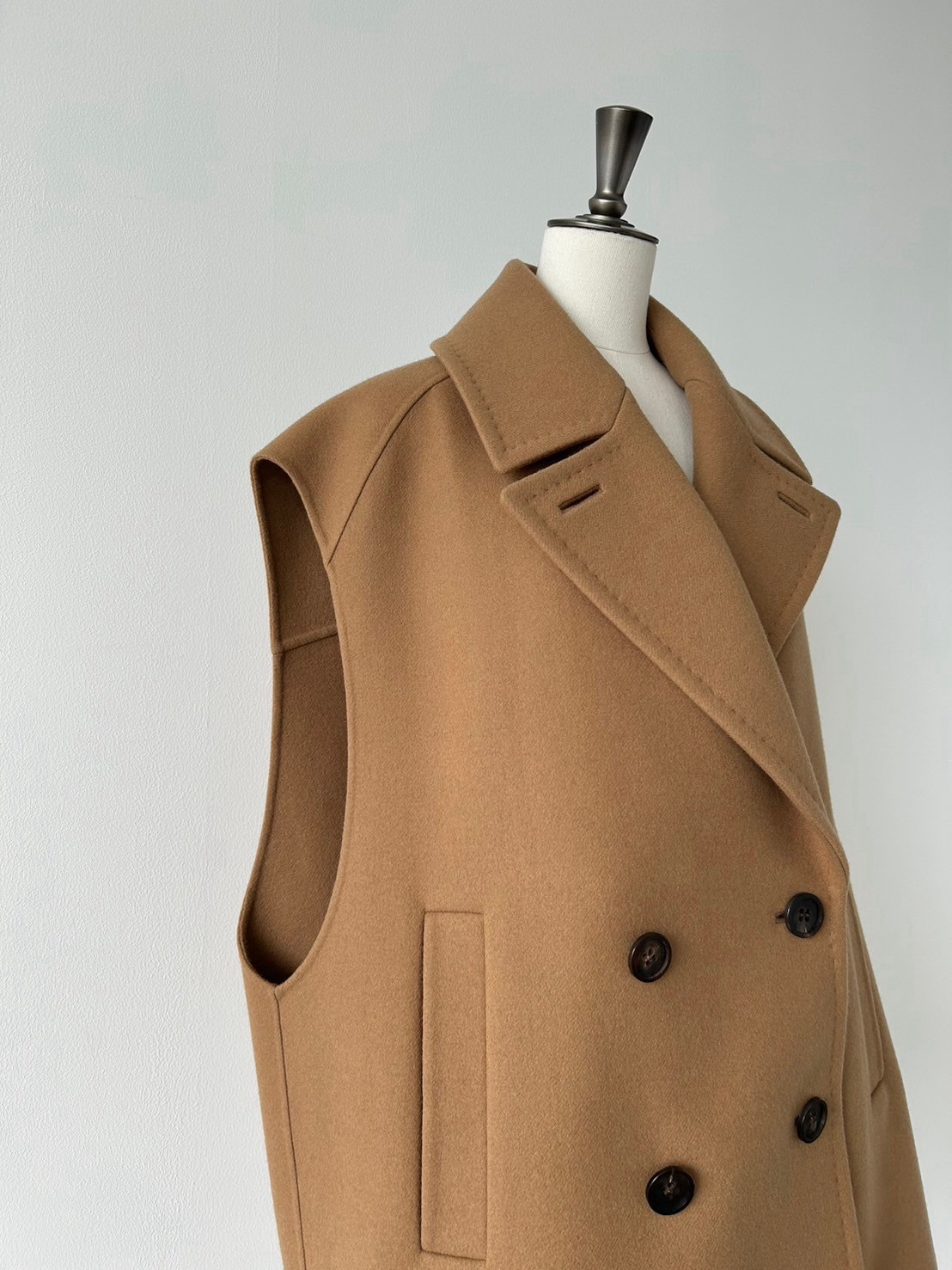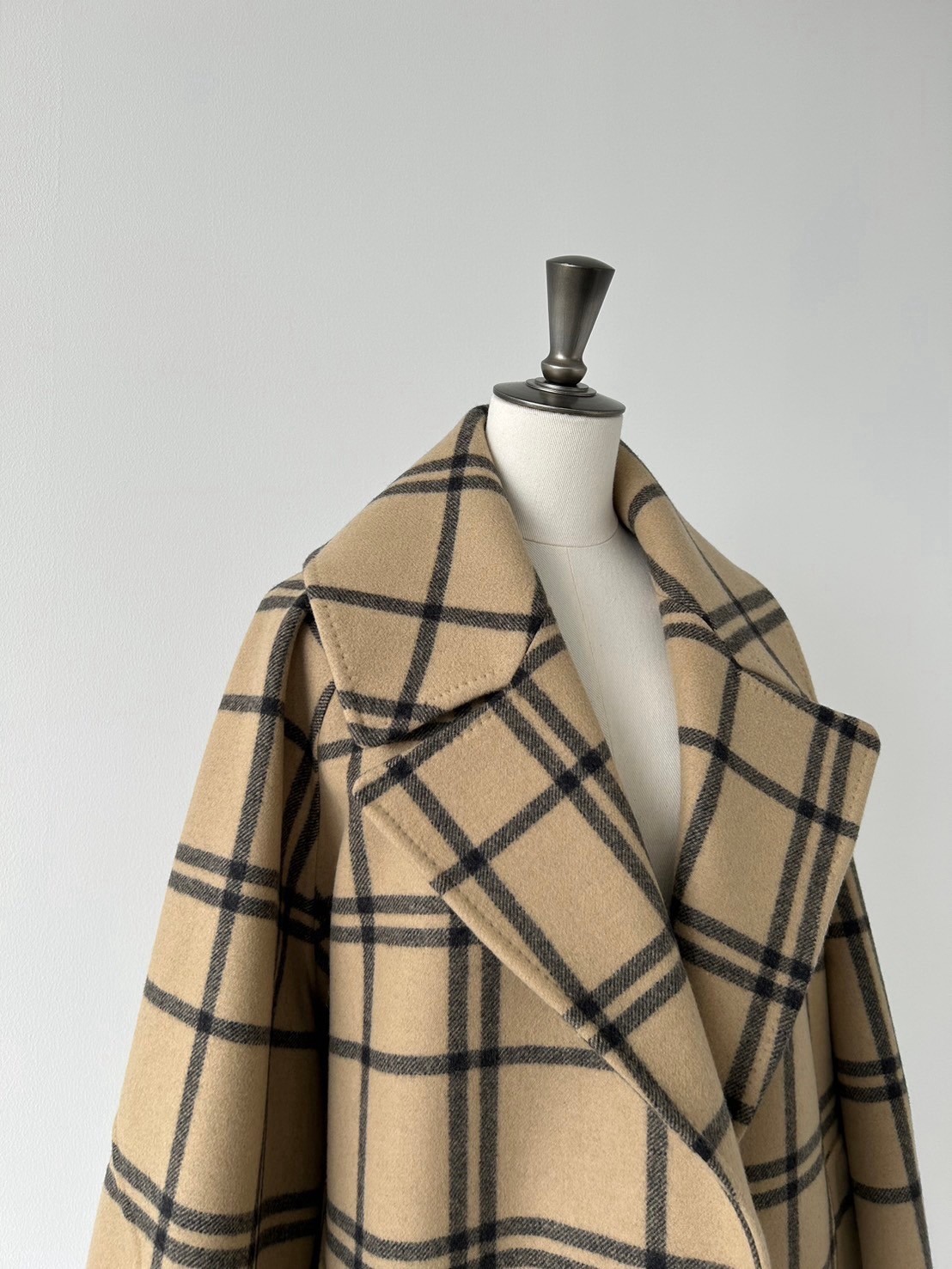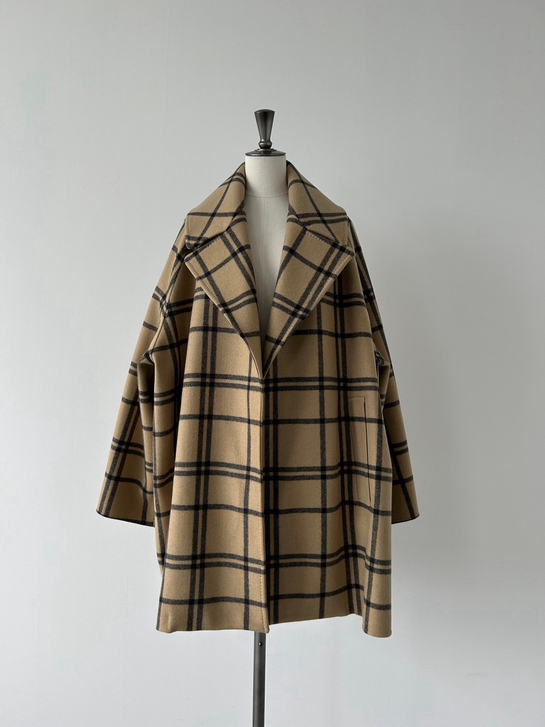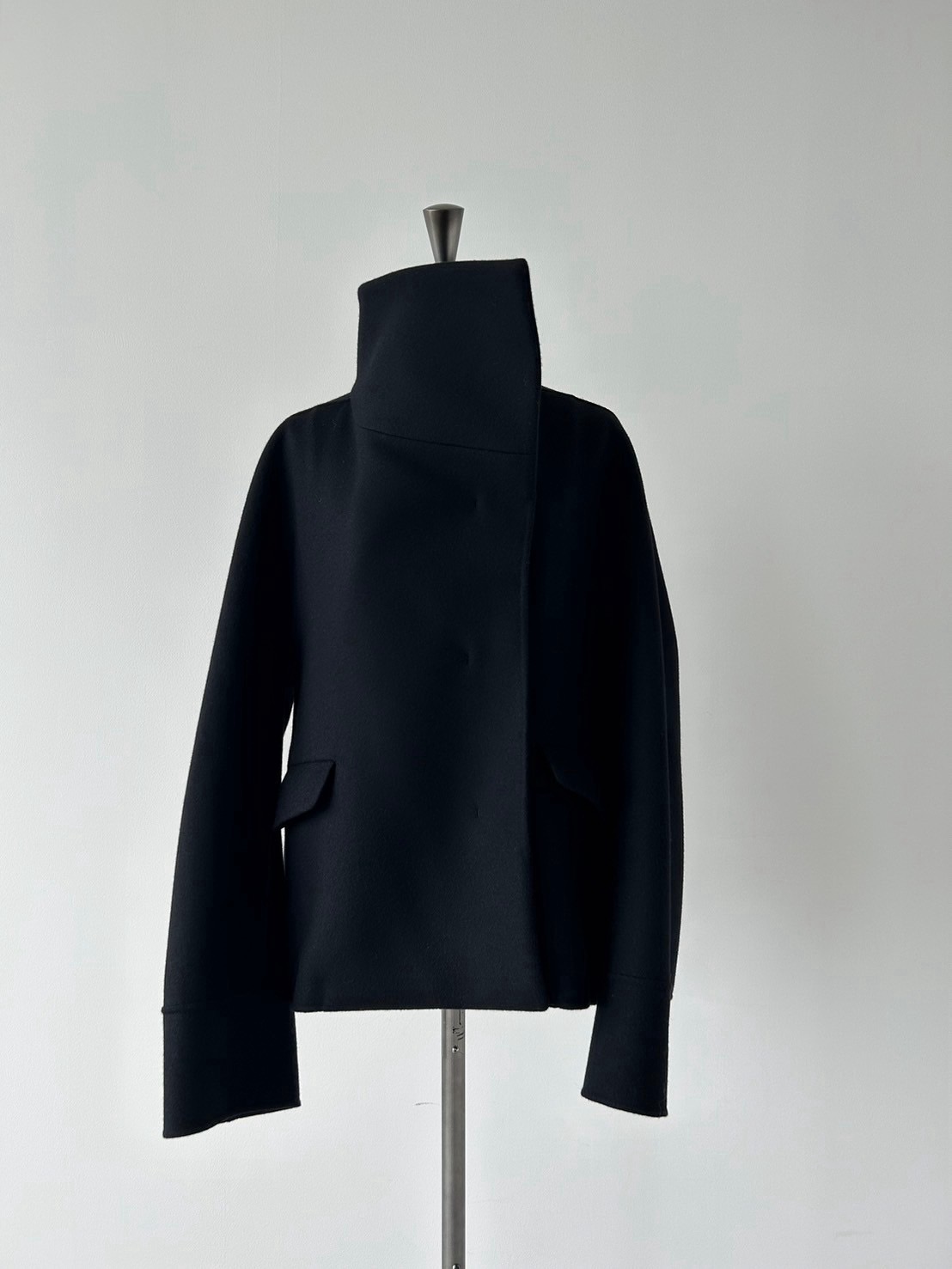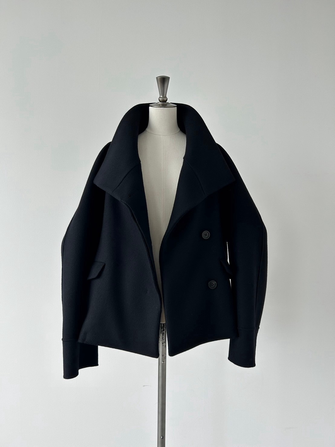 由于它是双排扣式外套,与短外套相比,给人一种更加流畅的印象。